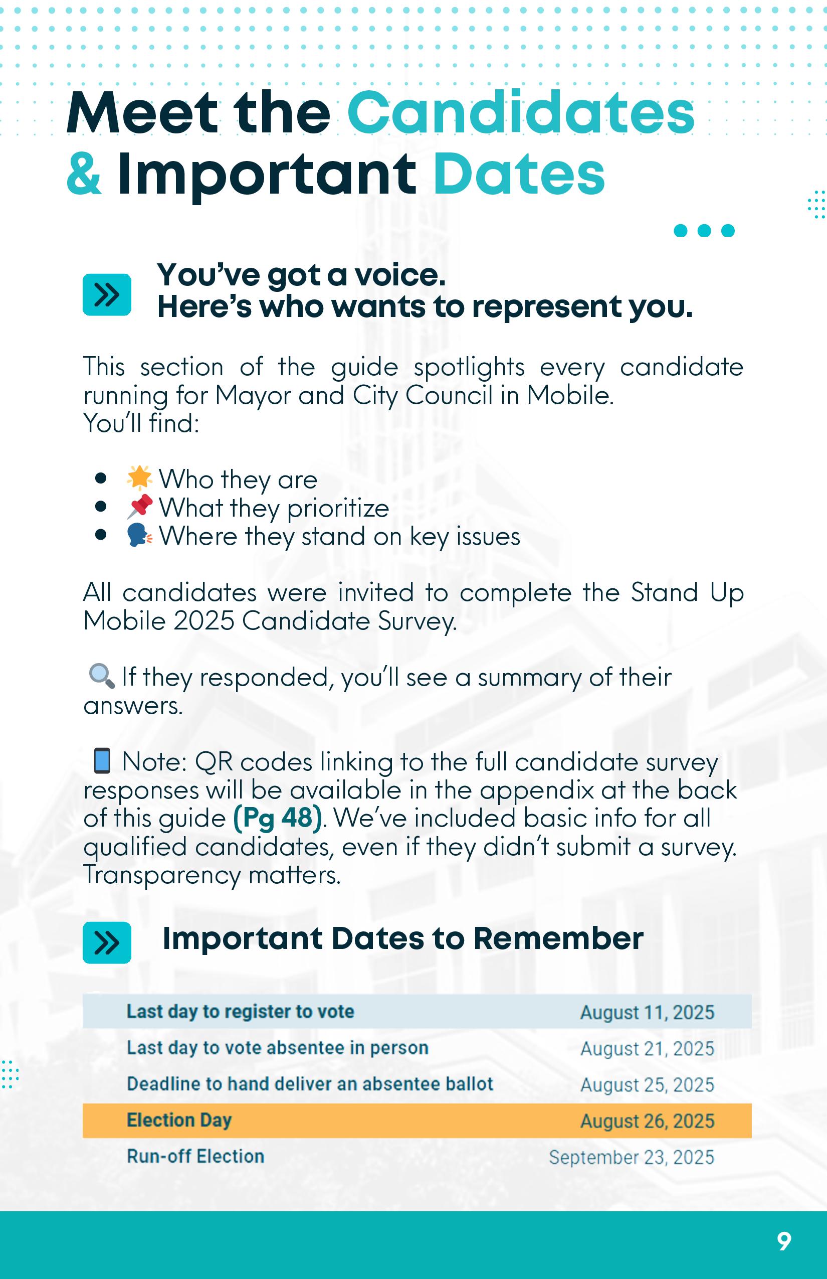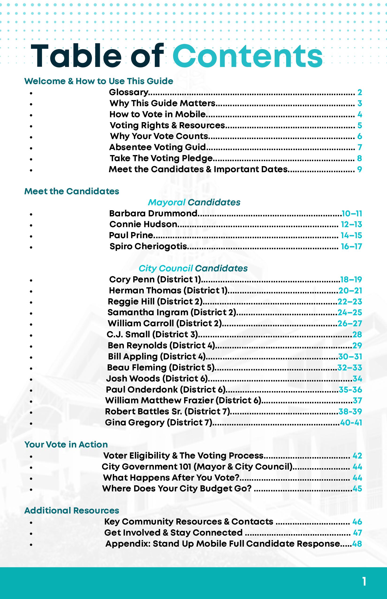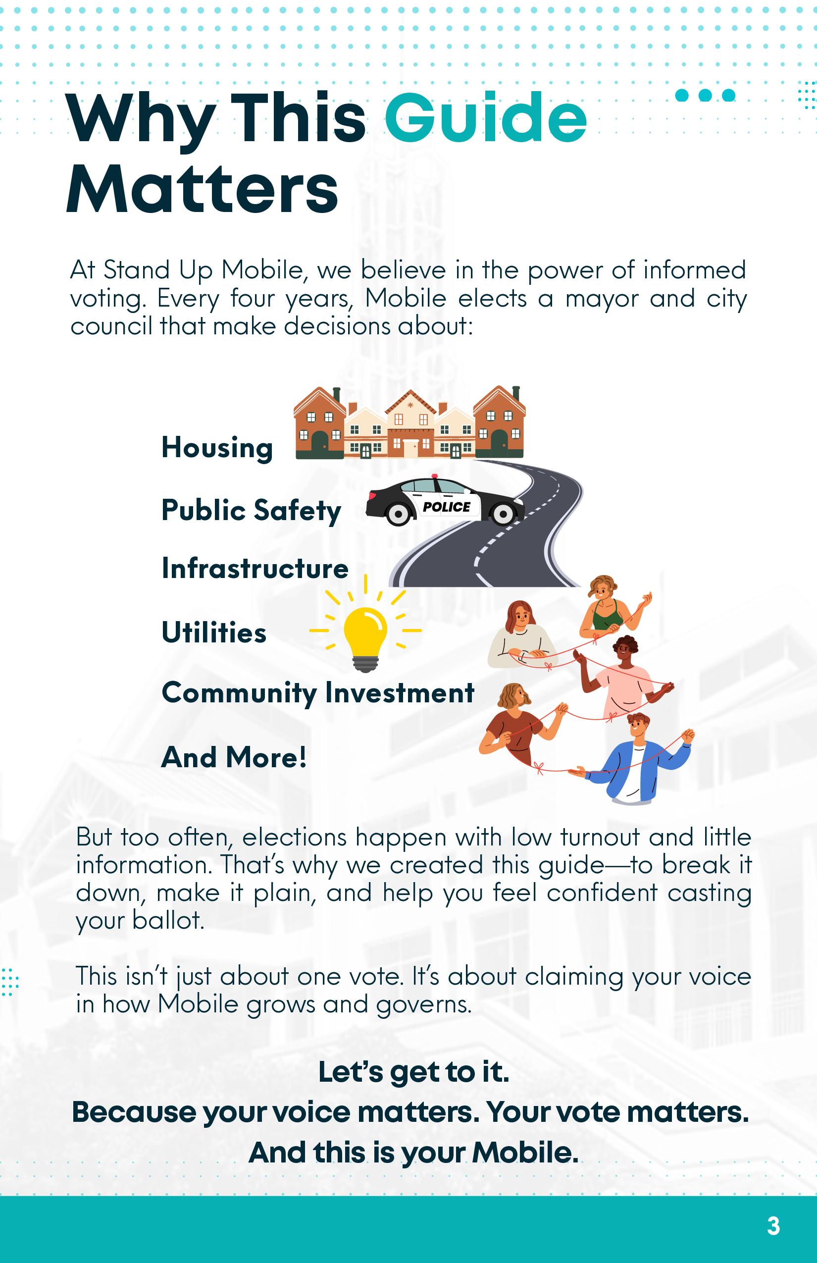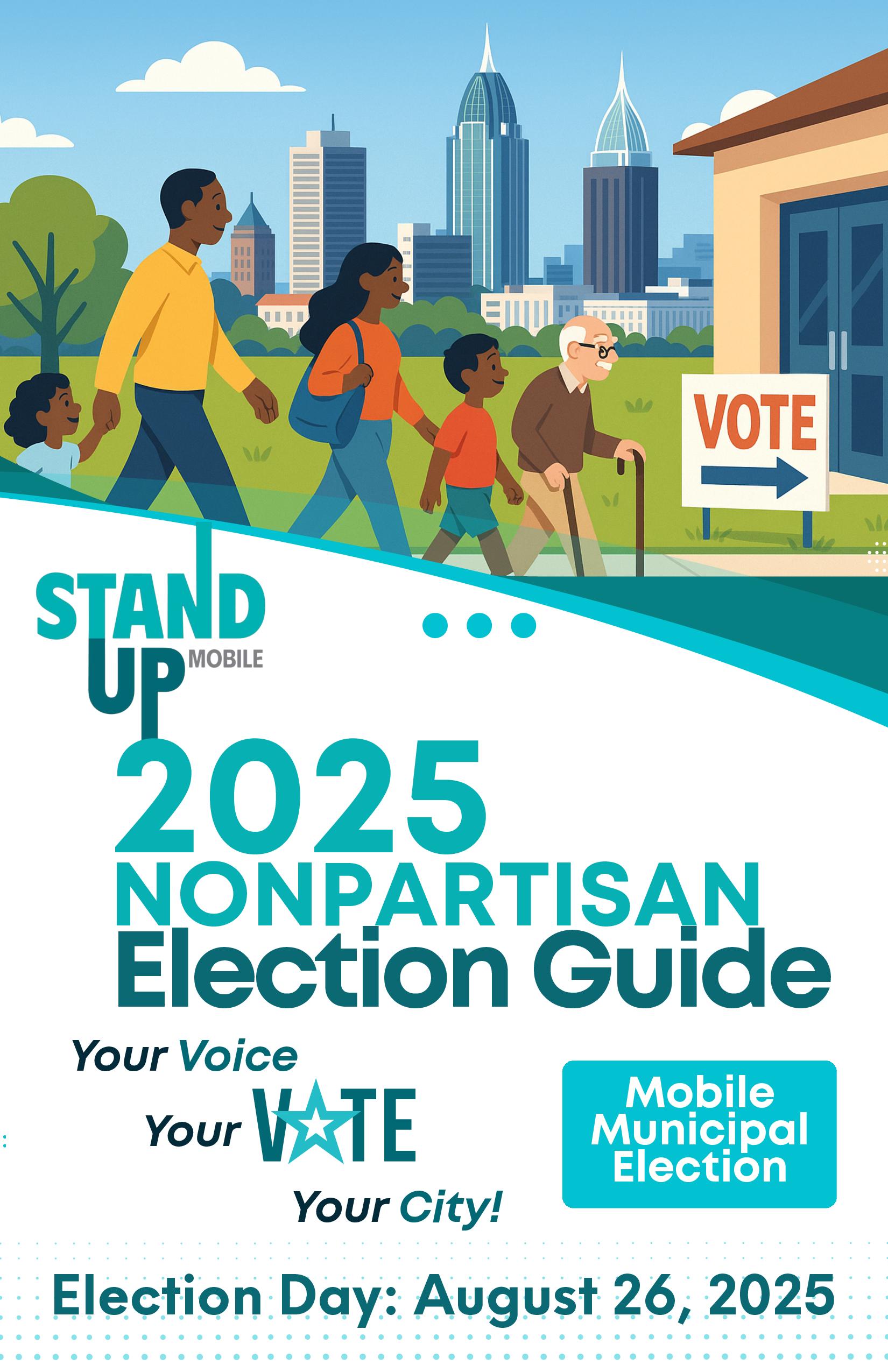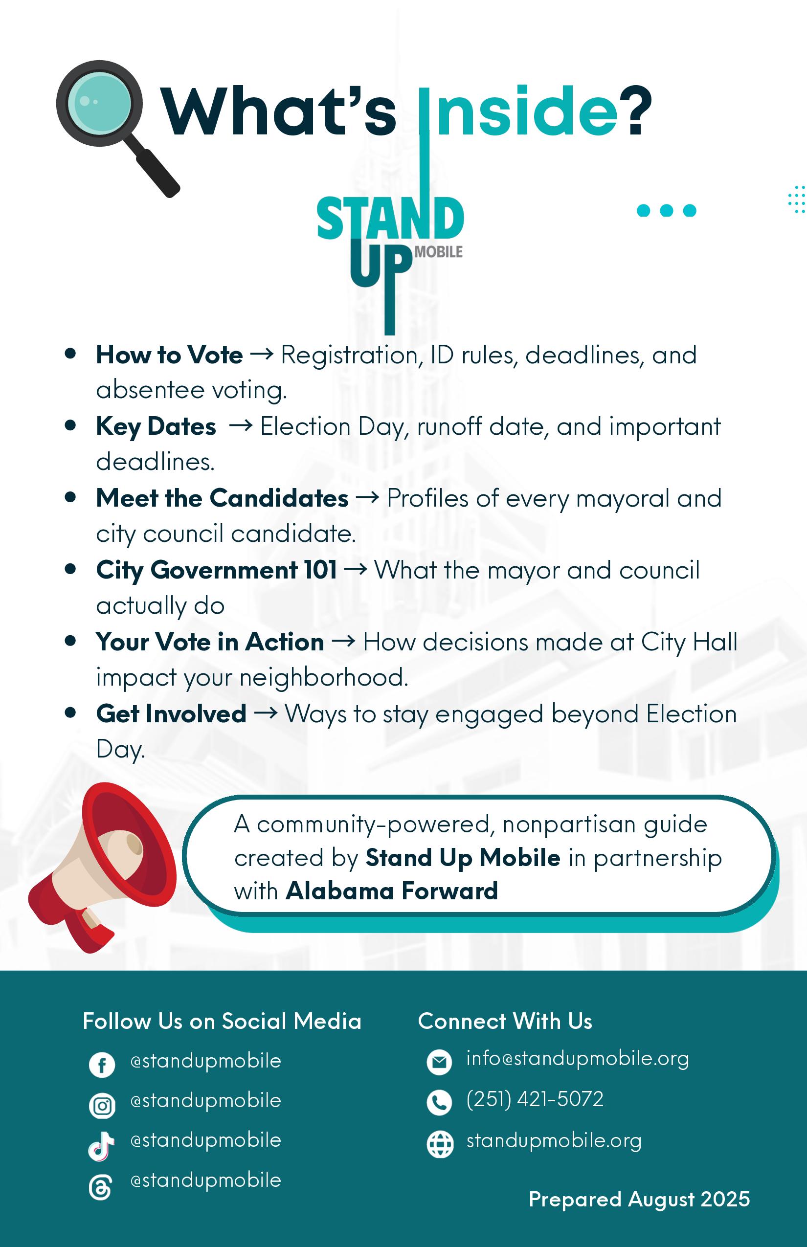 Stand Up Mobile created this nonpartisan guide to break down the voting process, make it plain, and help you feel confident casting your ballot. Inside you'll find information about voting logistics, key dates, the candidates, city government 101, how city hall impacts your neighborhood, and ways to get involved.
