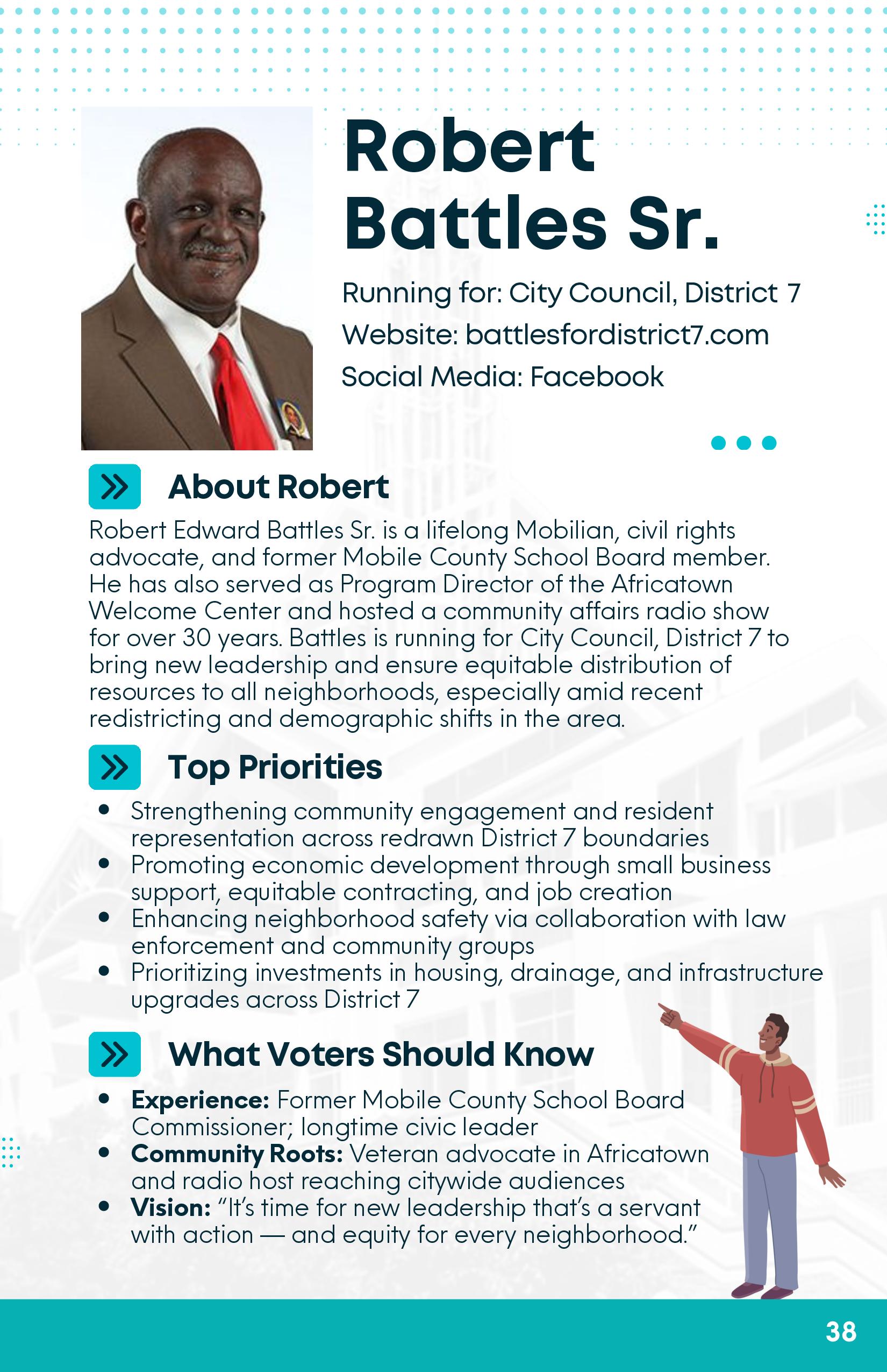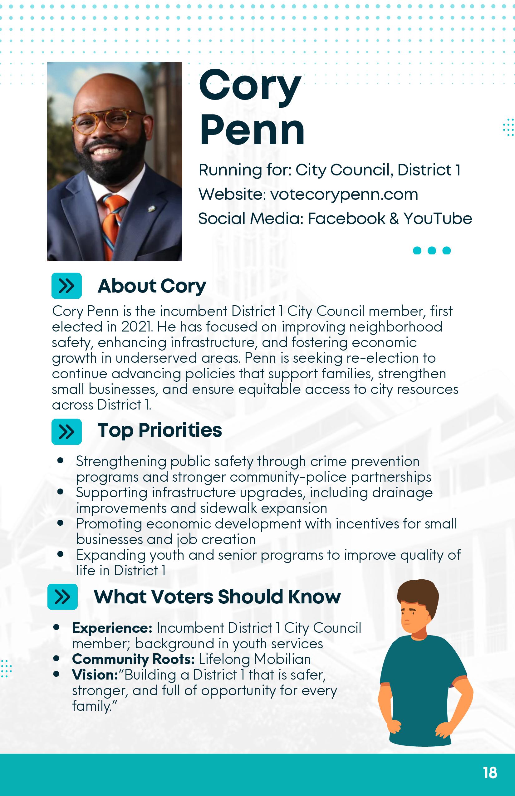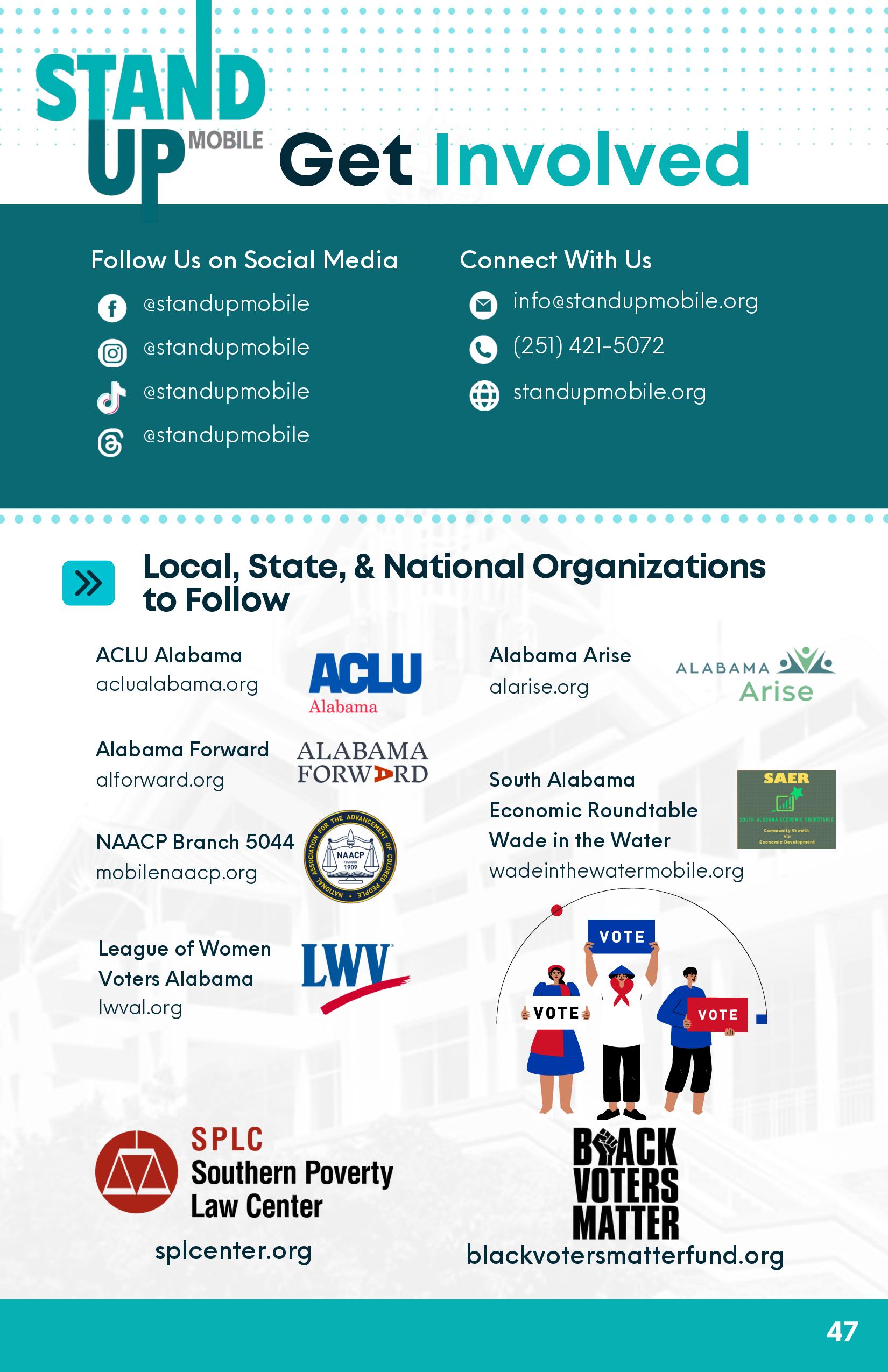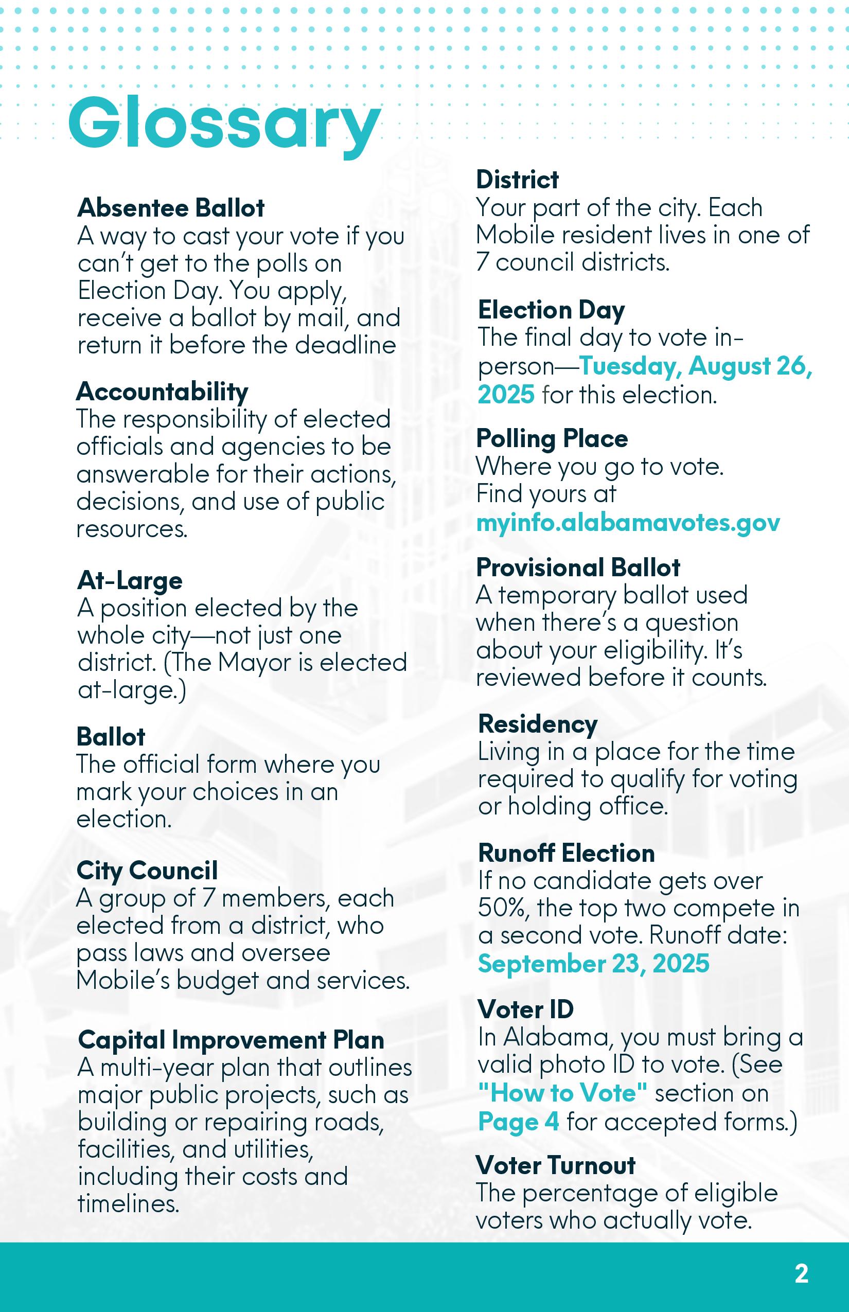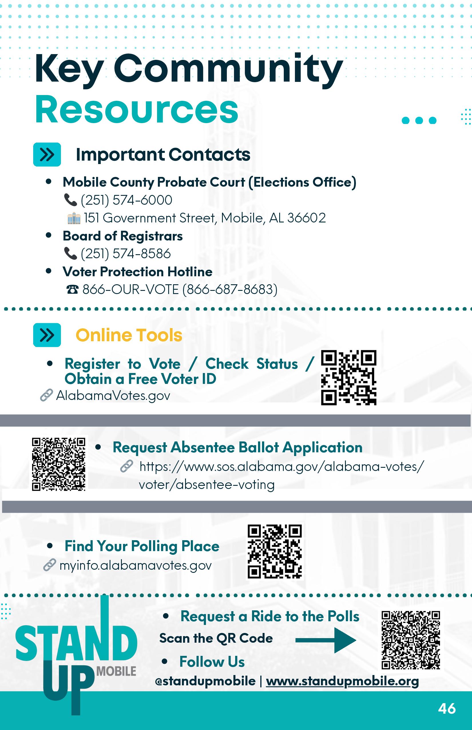 Stand Up Mobile created this nonpartisan guide to break down the voting process, make it plain, and help you feel confident casting your ballot. Inside you'll find information about voting logistics, key dates, the candidates, city government 101, how city hall impacts your neighborhood, and ways to get involved.