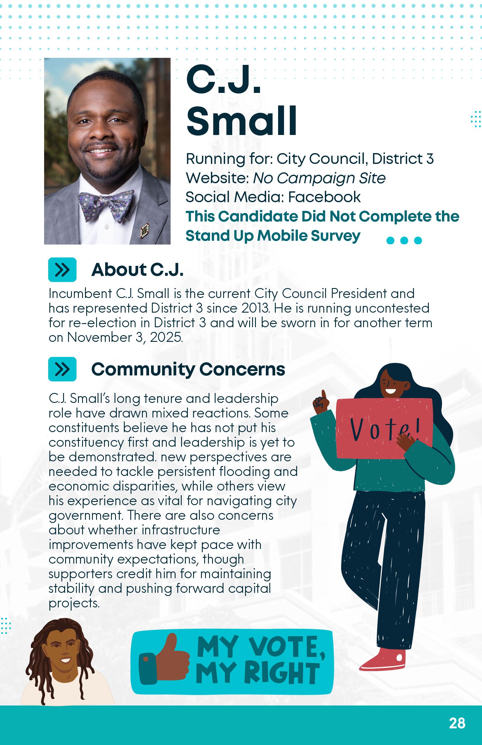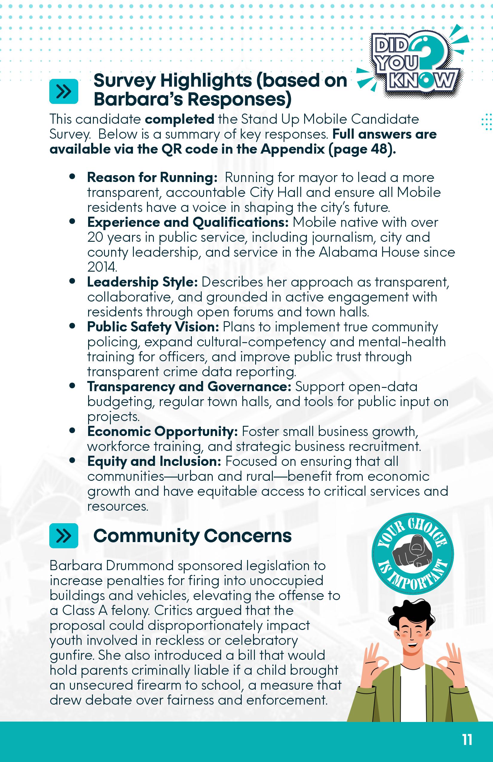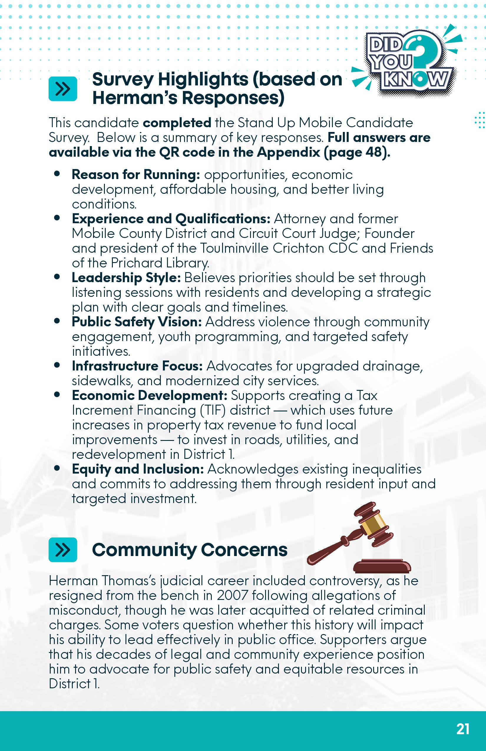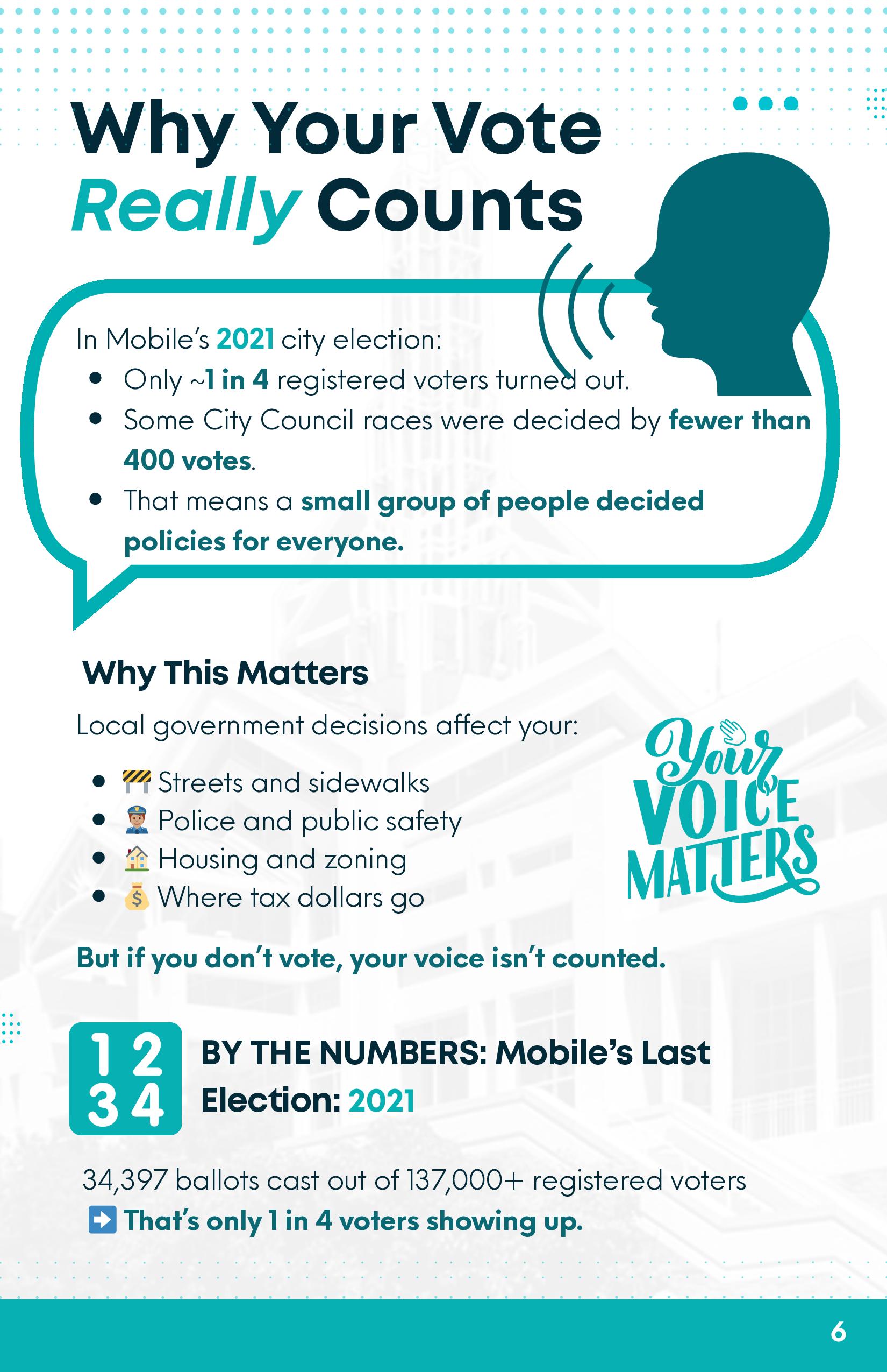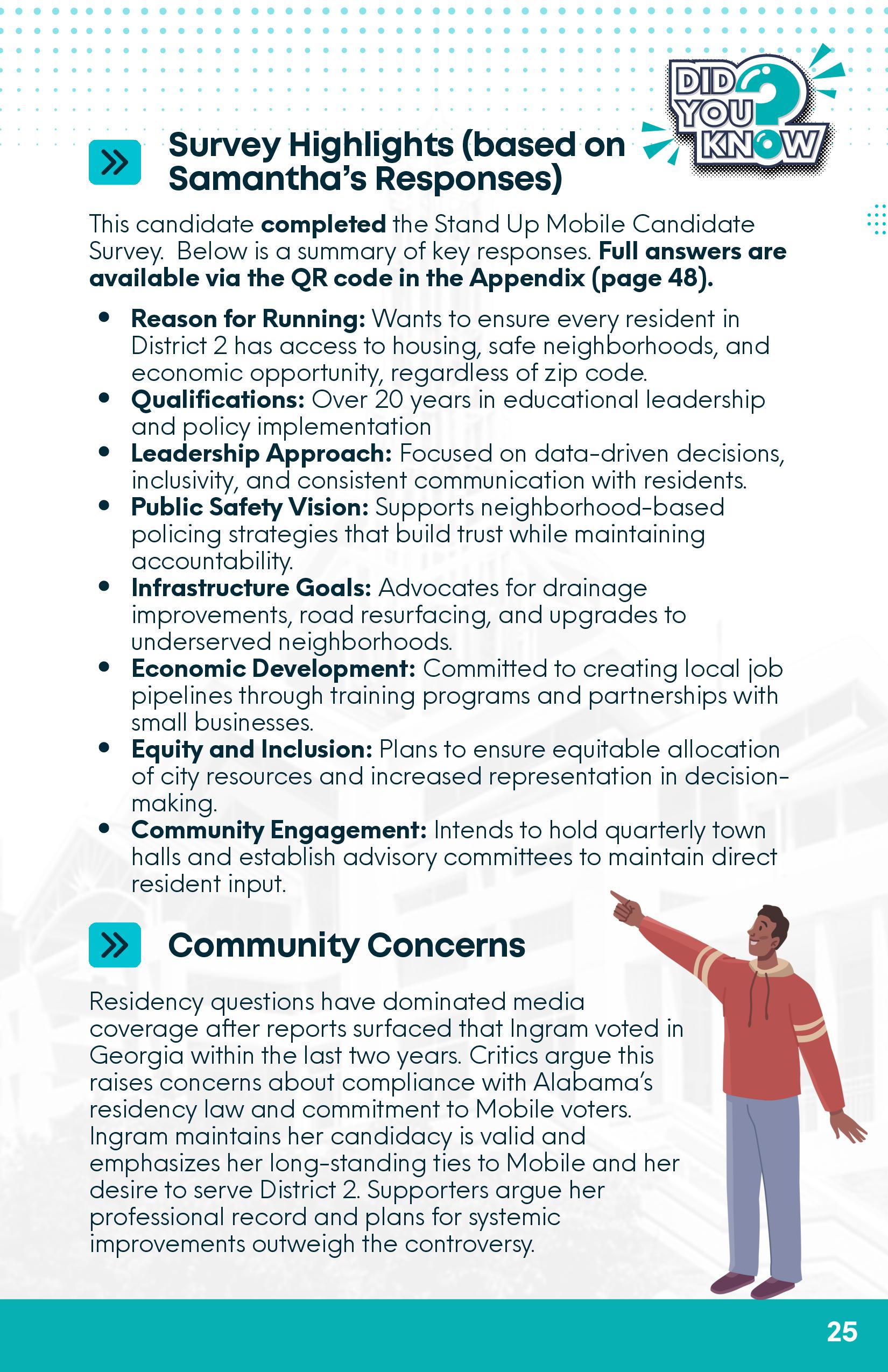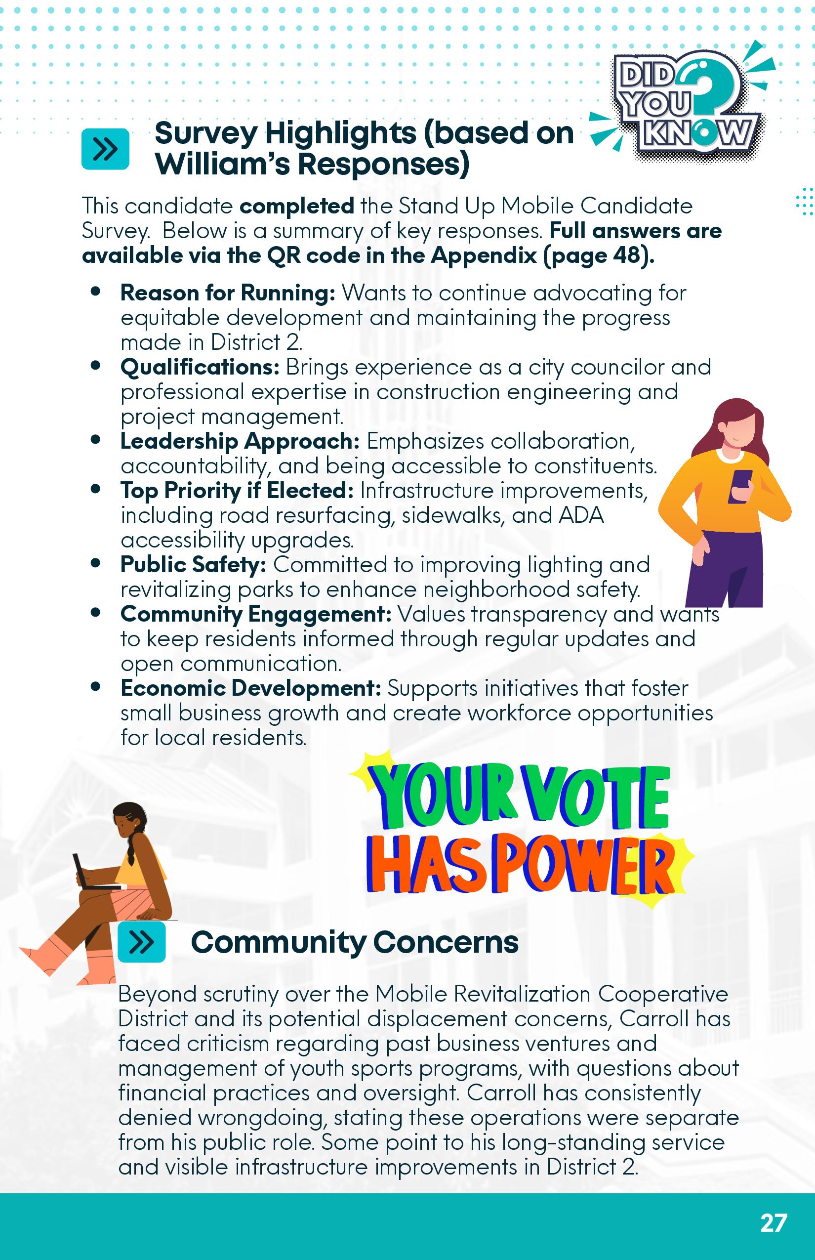 Stand Up Mobile created this nonpartisan guide to break down the voting process, make it plain, and help you feel confident casting your ballot. Inside you'll find information about voting logistics, key dates, the candidates, city government 101, how city hall impacts your neighborhood, and ways to get involved.