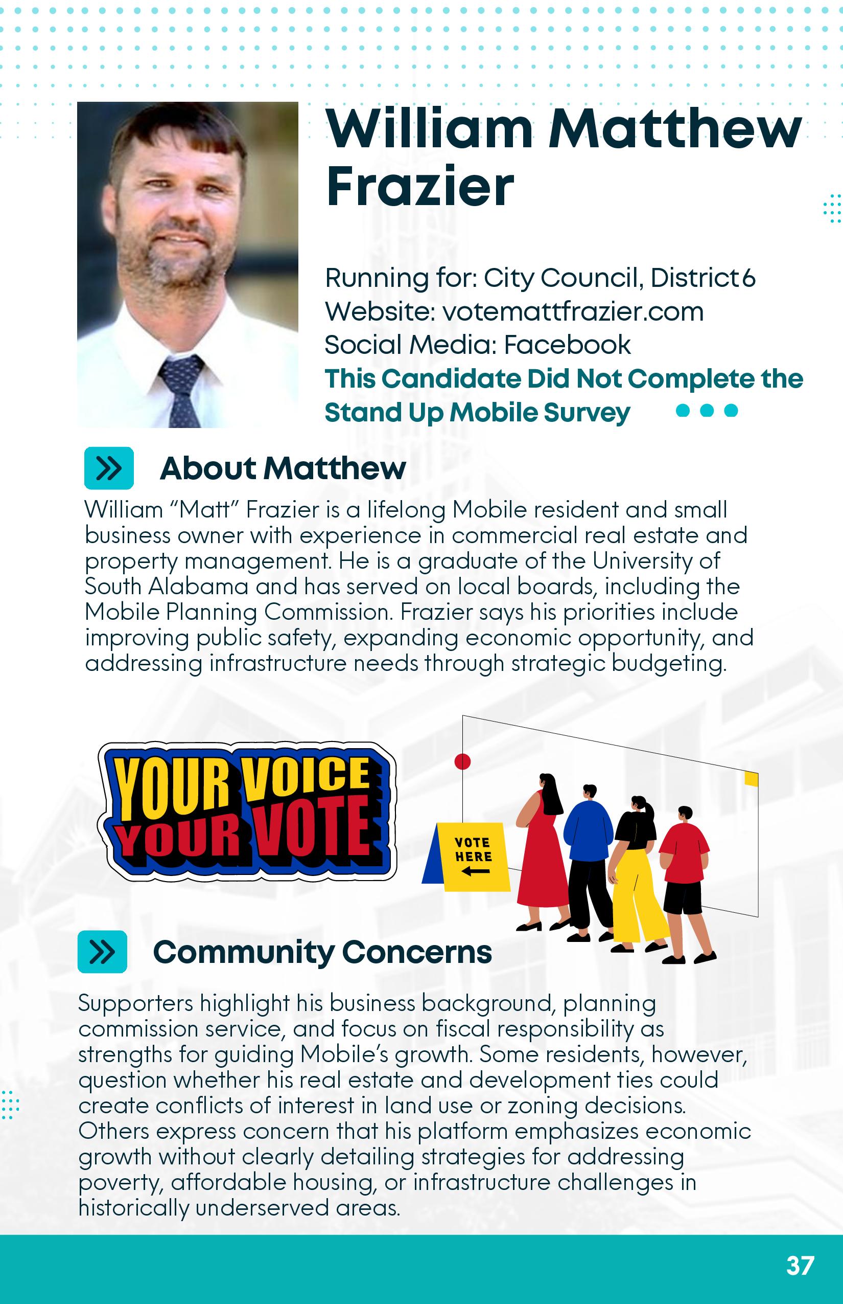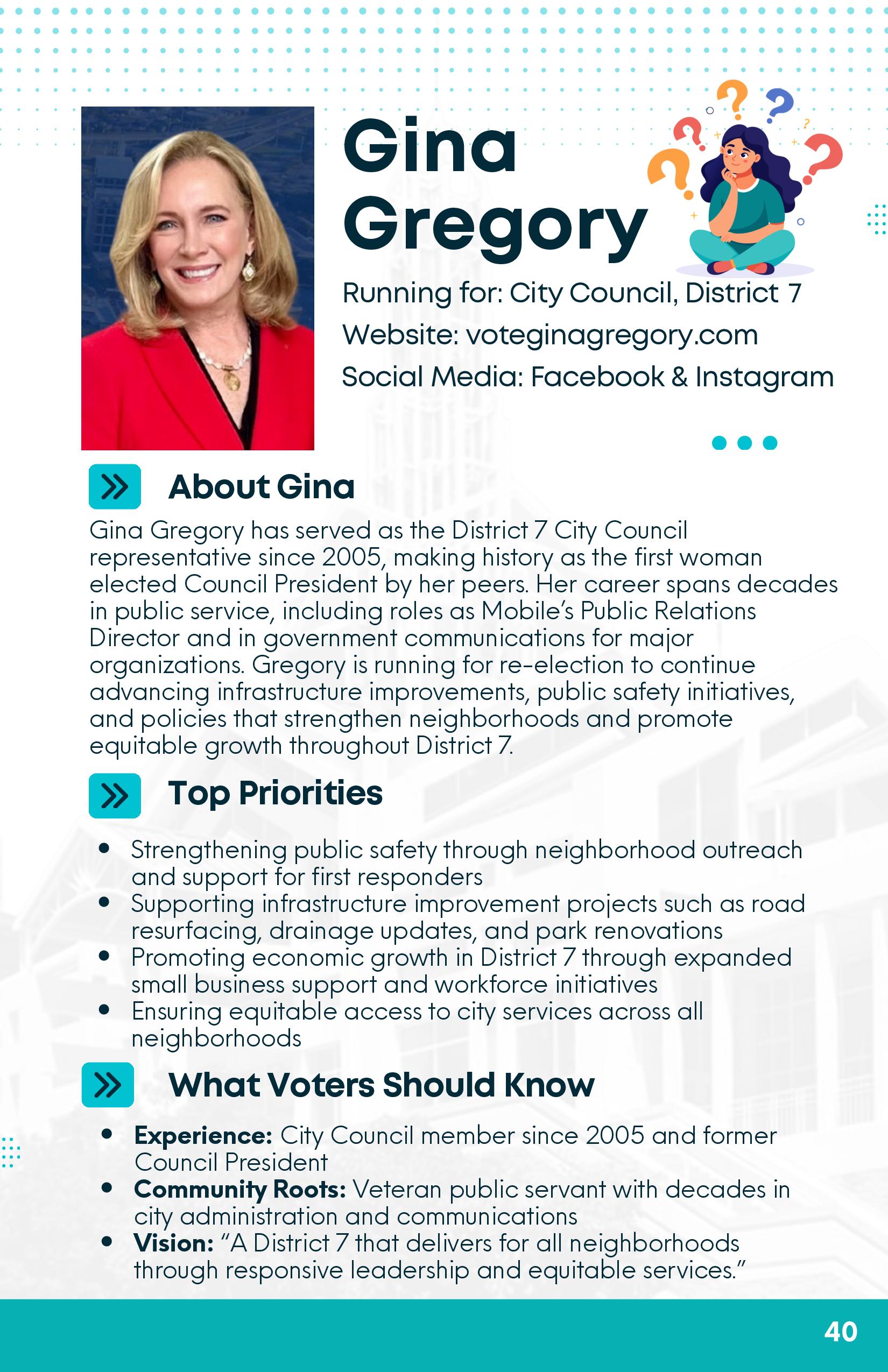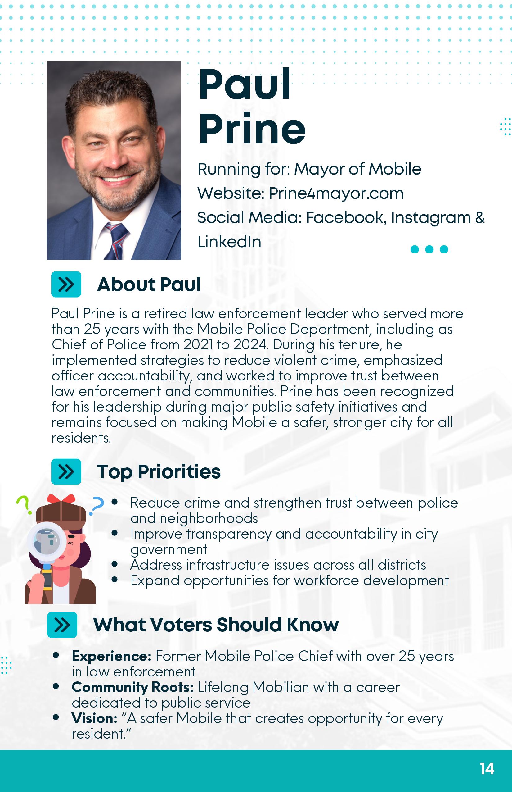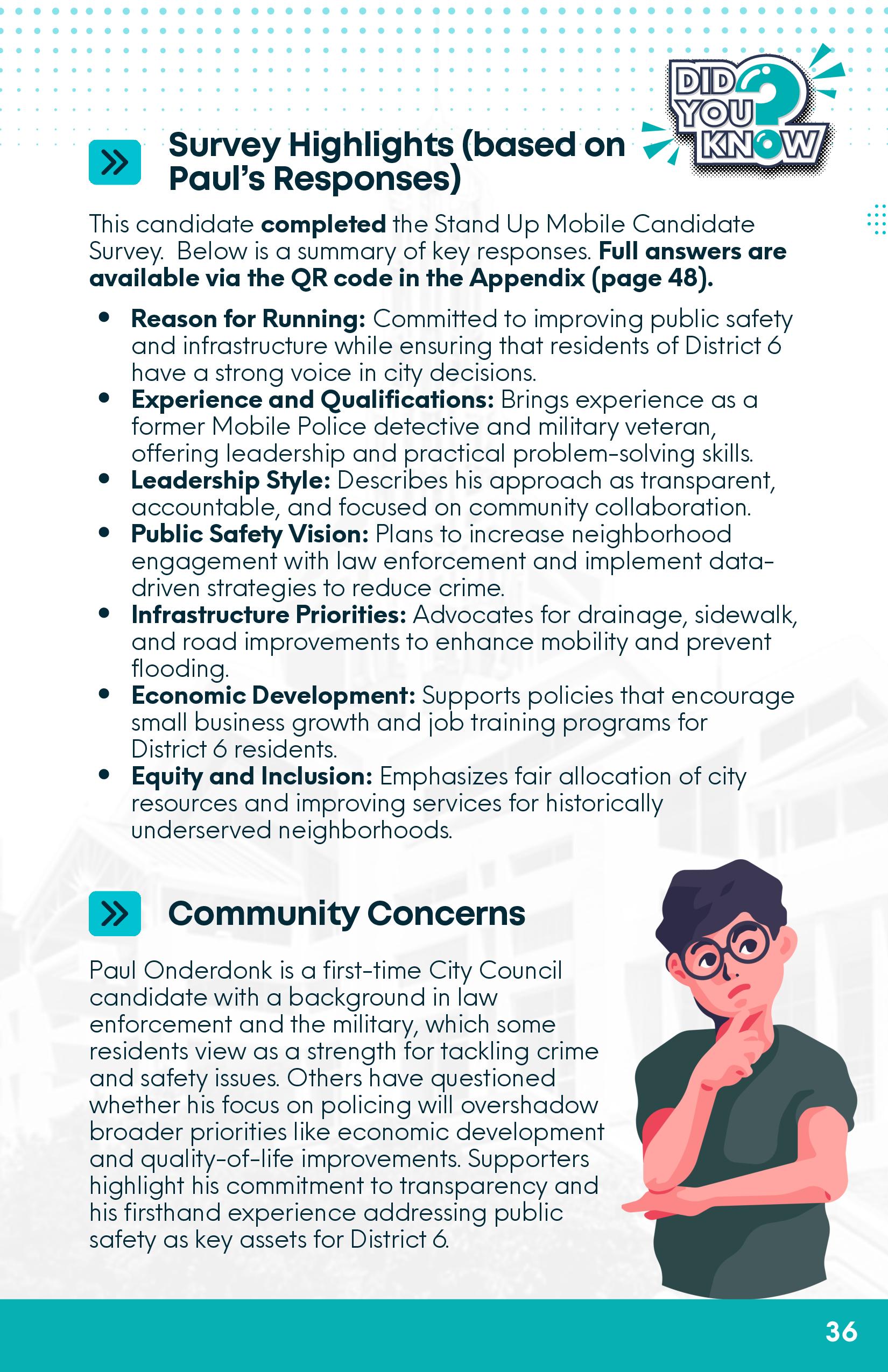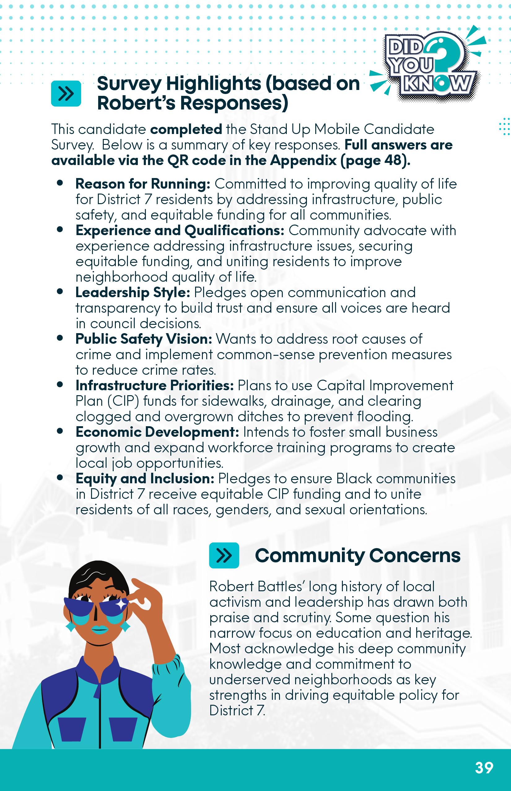 Stand Up Mobile created this nonpartisan guide to break down the voting process, make it plain, and help you feel confident casting your ballot. Inside you'll find information about voting logistics, key dates, the candidates, city government 101, how city hall impacts your neighborhood, and ways to get involved.