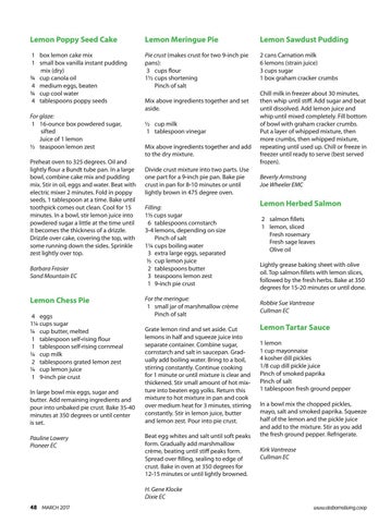 Lemon Chess Pie 4 eggs 1¼ cups sugar ¼ cup butter, melted 1 tablespoon self-rising flour 1 tablespoon self-rising cornmeal ¼ cup milk 2 tablespoons grated lemon zest ¼ cup lemon juice 1 9-inch pie crust In large bowl mix eggs, sugar and butter. Add remaining ingredients and pour into unbaked pie crust. Bake 35-40 minutes at 350 degrees or until center is set. Pauline Lowery Pioneer EC
