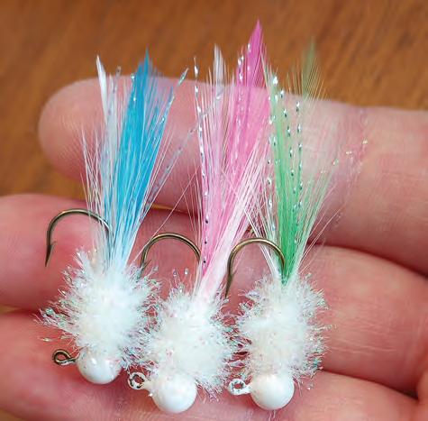“After I get the head baked, I decide on the materials,” Ryan says. “I use either marabou, which is a soft type of feather that undulates well in the water, synthetic fibers or chicken hackle.”