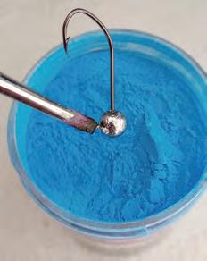 To make a jig, Ryan first powder-coats the lead heads to give them a tough baked-on finish. Then, he adds an ultraviolet