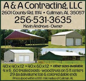 P.O. Box 244014, Montgomery, AL 36124 – Attn: Classifieds. How To Place a Line Ad in Marketplace Answers to puzzle on Page 28 Recipient’s Name:_____________________ Street: City: Zip: Phone: E-mail: RETURN WITH $12 CHECK PAYABLE TO ALABAMA LIVING MAIL TO: Alabama Living 340 TechnaCenter Drive Montgomery, AL 36117 ONLINE: www.alabamaliving.coop Give a 12-ISSUE gift subscription to for only $1 an issue. 1-800-232-AGRI (2474) • Steel Trusses & Shed Joists • Pole Barn Kits & Components NOW OFFERING! • All Steel (Red Iron) Bldg. Kits 2 Week Delivery or Less On: 20’ x 24’; 24’ x 30’; 30’ x 52’ Other Sizes Available - Longer Leads Apply OVER 50 YRS MFG TRUSSES