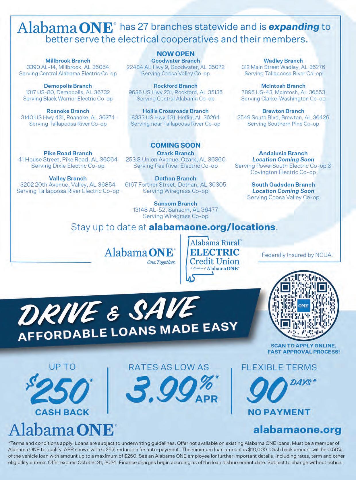 ALABAMA LIVING is delivered to some 420,000 Alabama families and businesses, which are members of 22 not-for-profit, consumer-owned, locally directed and taxpaying electric cooperatives. Subscriptions are $12 a year for individuals not subscribing through participating Alabama electric cooperatives. Alabama Living (USPS 029-920) is published monthly by the Alabama Rural Electric Association of Cooperatives. Periodicals postage paid at Montgomery, Alabama, and at additional mailing office.