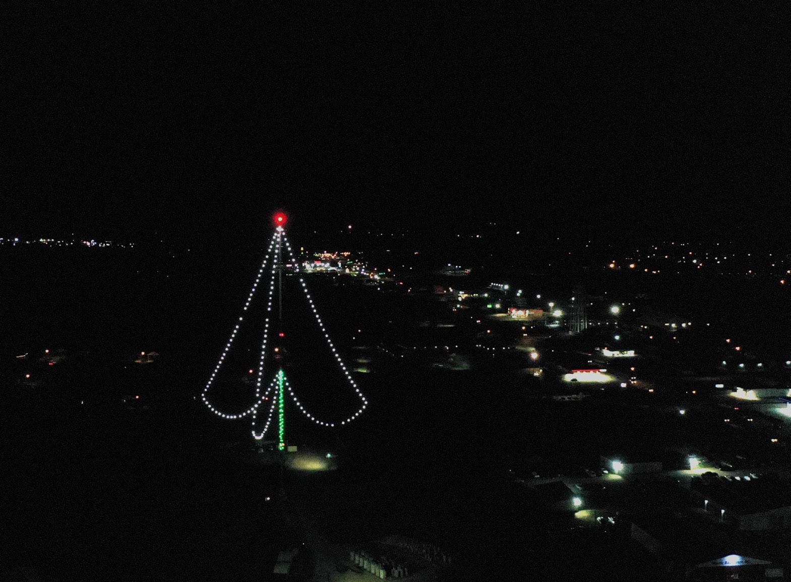 Anyone who has ever visited Demopolis during December has seen our giant Christmas tree here at Black Warrior EMC. Regardless of which direction you come from, you can’t miss the 320-feet-tall, 250-plus lights landmark. You may even think it is magically slowly rotating due the amazing optical illusion created by those strings of lights on the radio tower’s guy wires.