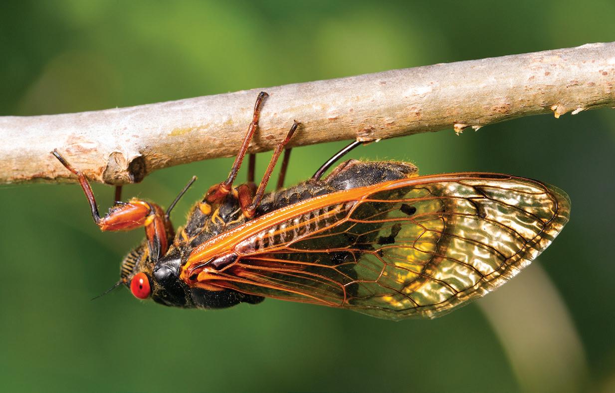 According to University of Alabama entomologist John Abbott, the 20 or so species of annual cicadas native to Alabama are pretty amazing creatures themselves. JULY TIPS Like their more famous periodical relatives, annual cicadas spend most of their lives (2 to 5 years depending on the species) underground before they emerge for brief and furious periods of courtship and mating. But unlike their periodical kin, annual cicadas don’t synchronize their appearances during a single year. Instead, different populations of various “annual” cicada species emerge every year, which means we get annual concerts performed by the male cicadas trying to impress (attract) females. Though cicadas may emerge anytime from May through September and even into October, they are at their most active during the hottest days of summer (usually July and August) thus earning them the nickname of “dog-day” cicadas. And, of course, they are not alone in their use of music to attract mates. Katydids, crickets and grasshoppers also perform summer love songs for their female audiences. But lucky us, we get free admission to their concerts, which feature a variety of musical styles and techniques unique to each species. According to Abbott, katydids, crickets and grasshoppers use stridulation, the process of rubbing their wings and/or legs together to make their music. Cicadas, on the other hand, flex their tymbals, accordion-like membranes located in their abdomens, to create their signature sounds. Together, these various insects join together for a festival of sound that goes on day and night through the summer, one that may admittedly be a bit much for the unaccustomed ear. But developing an ear for their music can also provide hours of summer entertainment, or at least a chance to develop a deeper appreciation of new musical genres. Like birds, each of these insect species has a distinctive sound that we can use to identify them by ear. Crickets, for examjoined after dark by the nighttime buzzing, rattling and rasping tunes of katydids. Grasshoppers sound much like katydids, but they sing during the day, joining their sounds with the shriller, louder and more sustained voices of cicadas, which typically call during the day and at dusk. Yes, those sounds can Cicadas are among several insect species that create the soundtrack of summer. Earlier be obnoxious and even this year in parts of the U.S., that soundtrack featured performances by members of the a bit creepy to some, but Brood X cicada band (pictured here), one of two periodical cicada species that emerge there’s nothing to fear synchronously every 17 and 13 years. PHOTO BY JOHN ABBOTT as none of these insects pose a threat to us humans, other animals or to our plants and crops. In fact, they are important to our ecosystems, providing sustenance for birds and other wildlife and helping aerate and fertilize soils. Abbott suggests checking out the songsofinsects.com website or other wildlife and entomologic organizations to learn more about these summer musicians. You can also become a citizen science effort, ideal for adults and children alike, by submitting observations about the flora and fauna in your yard and garden to iNaturalist (inaturalist.org) and other nature-focused databases. Most important of all is to listen to the insects, birds and frogs performing this summer’s concert season. “It’s part of our natural history and a part of nature we should enjoy,” Abbott says. Katie Jackson is a freelance writer and editor based in Opelika, Alabama. Contact her at katielamarjackson@gmail.com.