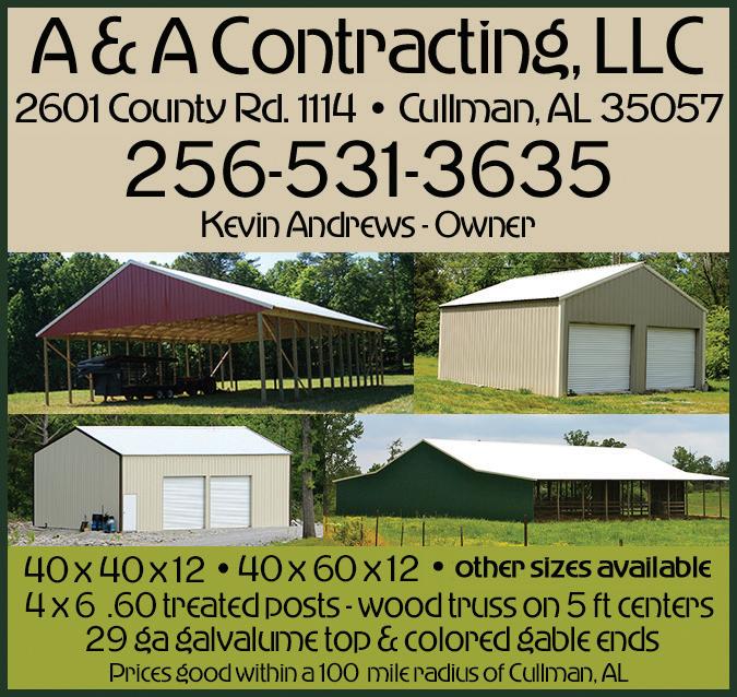 Closing Deadlines (in our office): January 2023 Issue by November 23 February 2023 Issue by December 23 March 2022 Issue by January 25 Ads are $1.75 per word with a 10 word minimum and are on a prepaid basis; Telephone numbers, email addresses and websites are considered 1 word each. Ads will not be taken over the phone. You may email your ad to hdutton@areapower.com; or call (800)410-2737 ask for Heather for pricing.; We accept checks, money orders and all major credit cards. Mail ad submission along with a check or money order made payable to ALABAMA LIVING, P.O. Box 244014, Montgomery, AL 36124 – Attn: Classifieds. How To Place a Line Ad in Marketplace P.O. BOX 389, ADDISON, AL 35540 256-747-8178 • FAX: 256-747-8760 WE SELL: Steel Trusses • Hay Barns Lumber • Equipment Sheds Building Material Packages Painted Metal • Work Shops Insulation • Kneebraces Galvalume Metal STEEL TRUSS BUILDINGS BUILT TO YOUR SPECIFICATIONS CECIL PIGGCECIL PIGG STEEL TRUSS, INC.