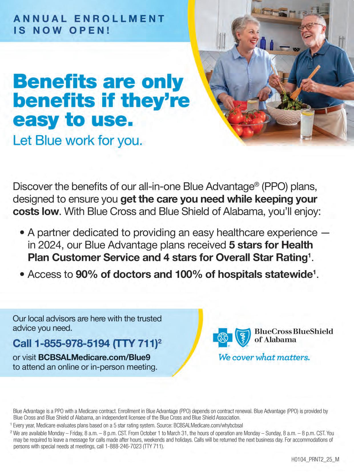 Closing Deadlines (in our office): January 2025 Issue by November 24 February 2025 Issue by December 24 March 2025 Issue by January 25 Ads are $1.75 per word with a 10 word minimum and are on a prepaid basis; Telephone numbers, email addresses and websites are considered 1 word each. Ads will not be taken over the phone. You may email your ad to hdutton@areapower.com; or call (800)410-2737 ask for Heather for pricing.; We accept checks, money orders and all major credit cards. Mail ad submission along with a check or money order made payable to ALABAMA LIVING, P.O. Box 244014, Montgomery, AL 36124 – Attn: Classifieds.