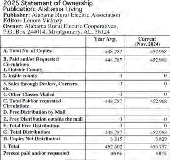 ALABAMA LIVING is delivered to some 420,000 Alabama families and businesses, which are members of 22 not-for-profit, consumer-owned, locally directed and taxpaying electric cooperatives. Subscriptions are $12 a year for individuals not subscribing through participating Alabama electric cooperatives. Alabama Living (USPS 029-920) is published monthly by the Alabama Rural Electric Association of Cooperatives. Periodicals postage paid at Montgomery, Alabama, and at additional mailing office.