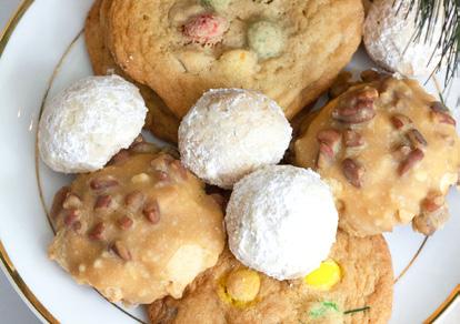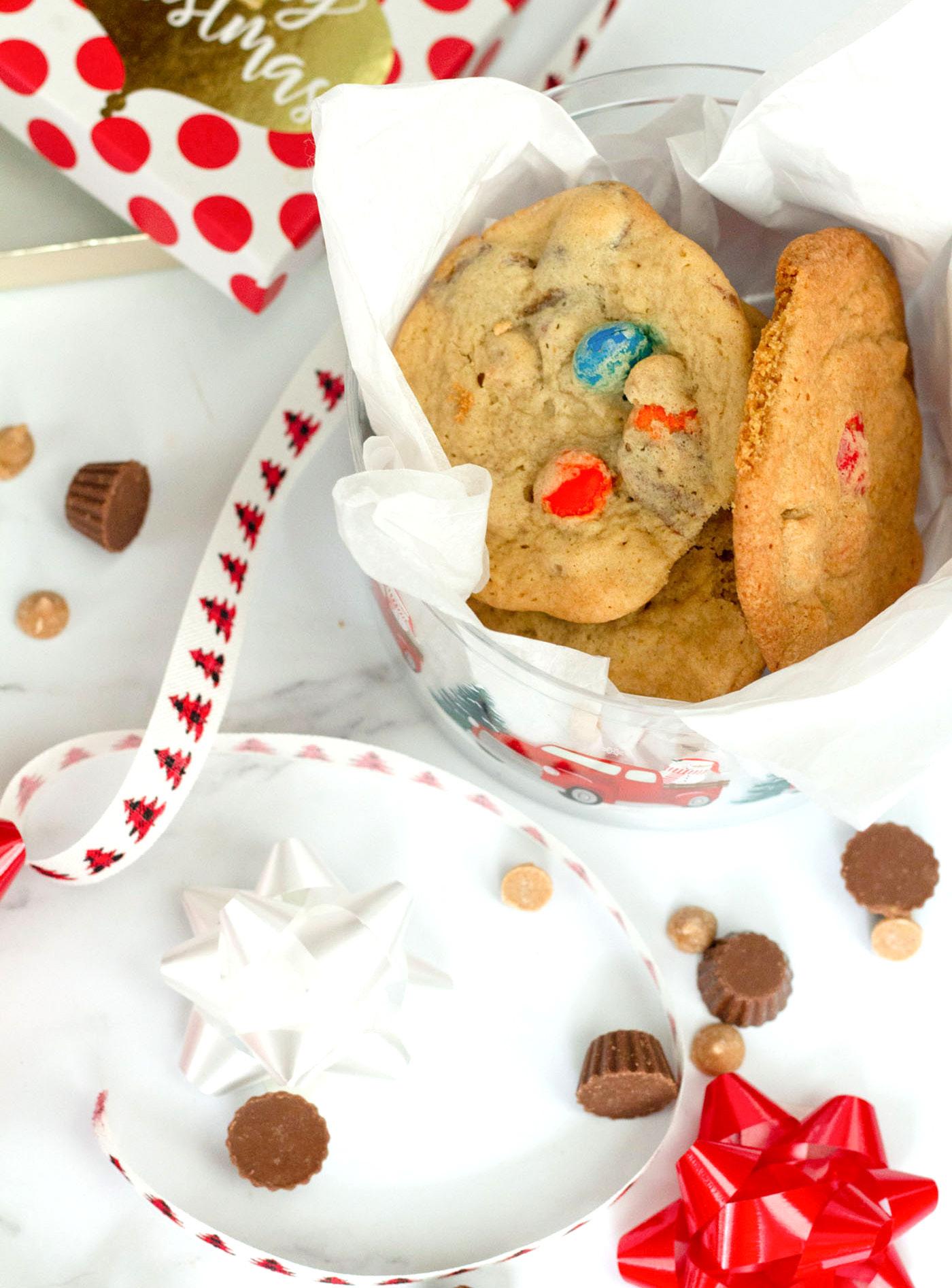Whisk dry ingredients together: all-purpose flour, baking soda and salt. (Whisking ensures ingredients are evenly dispersed throughout cookie dough.) Next, beat the butter and both brown and white sugars together for 1 to 2 minutes until they are well combined. Mix in the eggs one at a time and then add the vanilla extract. Additionally, stop to scrape the sides of the bowl occasionally. Add your dry ingredients to the butter/sugar mixture and mix until they are just combined. Mix in the Reese’s Peanut Butter Cups, M&M’s, and chips by gently folding them into the cookie dough until they are incorporated. Line baking pans with parchment paper so cookies will not stick. Use an ice cream or cookie scoop to dip out cookie dough, allowing each cookie to be an equal proportion. Set the oven to 350 degrees and bake cookies for 10 to 12 minutes. Cookie tops should be set and have a golden-brown edge. Remove from oven and cool.