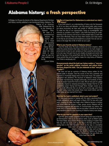 hy is it important for Alabamians to understand our state’s history? If you think about it, our understanding of history sets the framework for all of our ideas and attitudes—not only about public policy issues, but about encounters we have with people of different backgrounds. To make the best of our opportunities, being as knowledgeable and informed as possible is very helpful. I also think that having an understanding of the concerns and issues of other people helps us work with them more effectively. There are many other reasons, but it also seems to me that we are enriched and broadened as people if we can see ourselves in the larger flow of life of which we are a part. What is your favorite period of Alabama history? I love the whole story. My book is divided into seven chapters, which reflect the period divisions that make most sense to me. Each chapter or period seems to have its own narrative arc that is powerful and profound in its own way. And each has its own clusters of people and events that give the big story of the period flesh and life. But then seeing the way these periods flow and link together makes for a big history of Alabama that I think is wondrously rich. Announcements about the book say it gives readers a “new perspective” on the social, political, economic and culture forces that have shaped the state. Can you elaborate on that “new perspective”? We have not had an overview of Alabama history written for the general public in decades. Over the course of this time, scientists and engineers in Huntsville helped send a man to the moon. The system of segregation was abolished. The structure of Alabama’s heavy industry and textile manufacturing changed profoundly, and hundreds of thousands of people moved from farms to cities. We are now part of a global community shaped by sweeping technological changes that hit us with accelerating speed. Having lived through these changes causes us to see the world differently than we did a half a century ago, and I think we need history books that include these more recent stories and that reflect what we have learned from them. Now that the book is published, what is your next project? I’m very much involved in helping with the state’s upcoming Bicentennial celebrations, which will begin in March 2017. For two and a half years, covering the years that began when Alabama became a territory and ended when we became a state, groups across Alabama will be developing programs and activities to commemorate our history—the whole story of how we became who we are today. It should be an especially wonderful time for more exploring of Alabama history more deeply. What do you read for pleasure in your spare time? I love the “great courses” programs and am doing one now on the Italian Renaissance. I also try to mix serious works, such as Robert Caro’s The Power Broker, about Robert Moses and the building of modern New York city, with fun reads, such as The Boys in the Boat, about the U.S. rowing team in the 1936 Olympics—which, by the way, is a wonderful book. And I am going back to dig out some of the classics I missed along the way, such as Adam Smith’s The Wealth of Nations and George Eliot’s Middlemarch. Can you think of a richer feast than that?