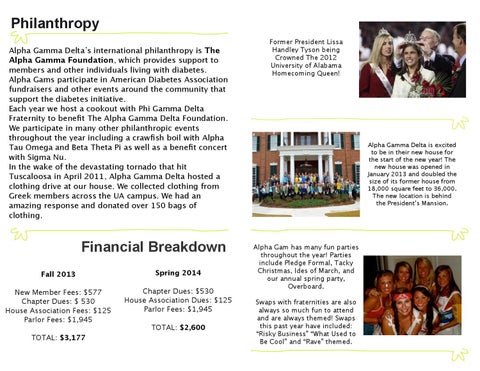 Philanthropy Alpha Gamma Delta’s international philanthropy is The Alpha Gamma Foundation, which provides support to members and other individuals living with diabetes. Alpha Gams participate in American Diabetes Association fundraisers and other events around the community that support the diabetes initiative. Each year we host a cookout with Phi Gamma Delta Fraternity to benefit The Alpha Gamma Delta Foundation. We participate in many other philanthropic events throughout the year including a crawfish boil with Alpha Tau Omega and Beta Theta Pi as well as a benefit concert with Sigma Nu. In the wake of the devastating tornado that hit Tuscaloosa in April 2011, Alpha Gamma Delta hosted a clothing drive at our house. We collected clothing from Greek members across the UA campus. We had an amazing response and donated over 150 bags of clothing.