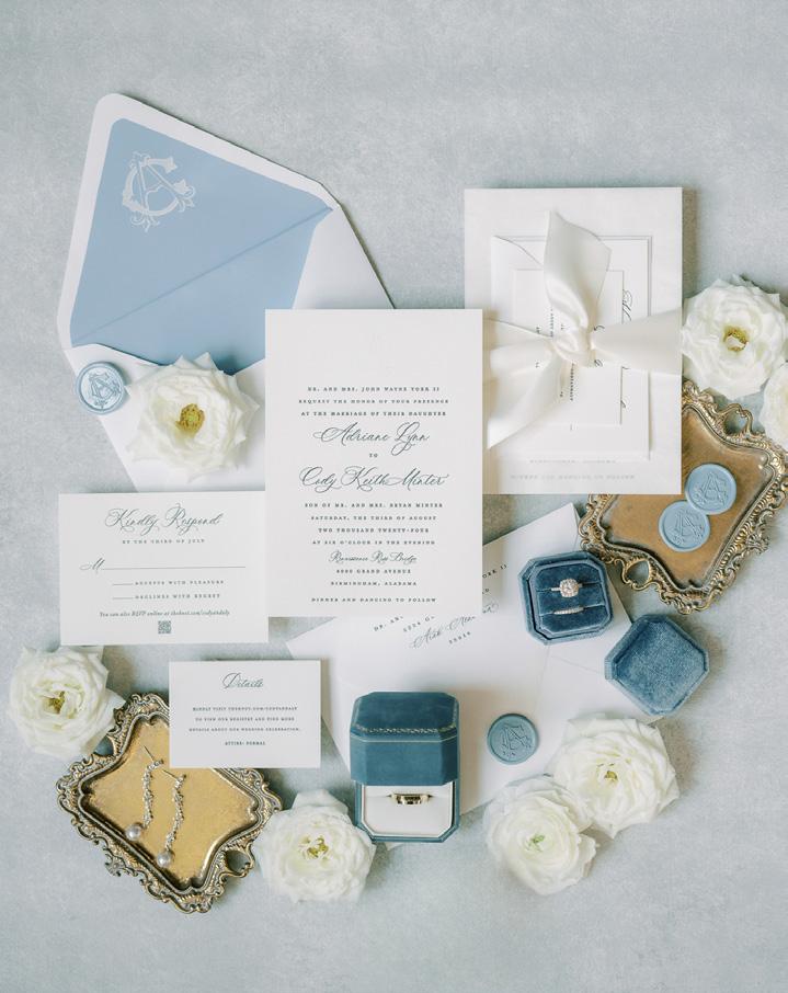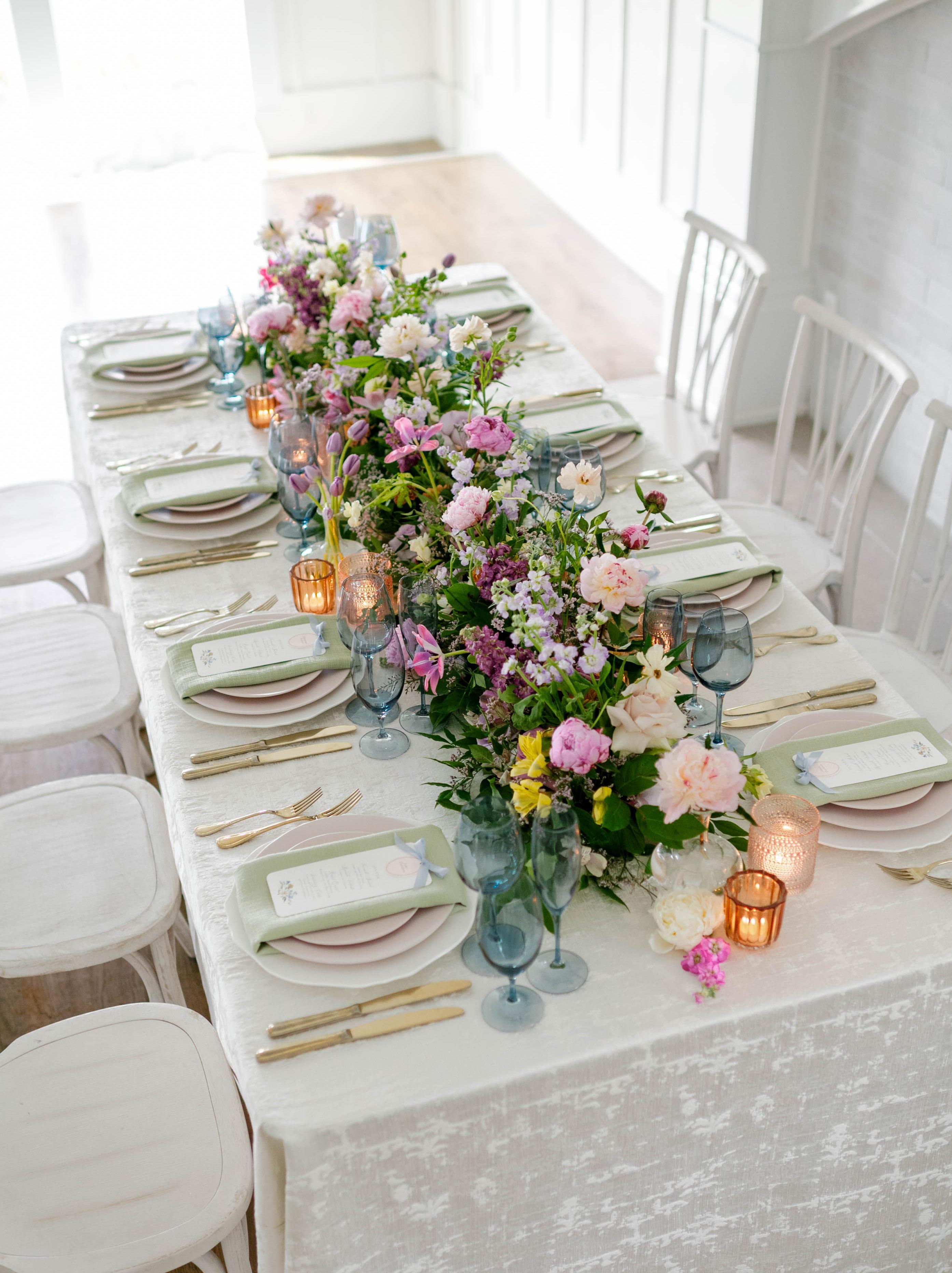 “Our wedding palette took inspiration from the French country, honing in on the elegant ash blues and warm whites. I wanted a palette that complemented and highlighted the traditional French restoration of The 1616 House that Cristina and Spencer have spent so much love and time crafting. Pops of romantic pale pinks and the dark natural greenery expanded the palette to feel complete.”