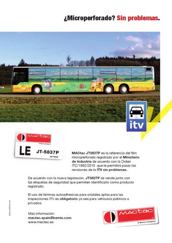 De acuerdo con la nueva legislación, JT5837P se vende junto con las etiquetas de seguridad que permiten identificarlo como producto registrado. El uso de láminas autoadhesivas para cristales aptas para las inspecciones ITV es obligatorio ya sea para vehículos públicos o privados. Más información: mactac.spain@bemis.com www.mactac.es