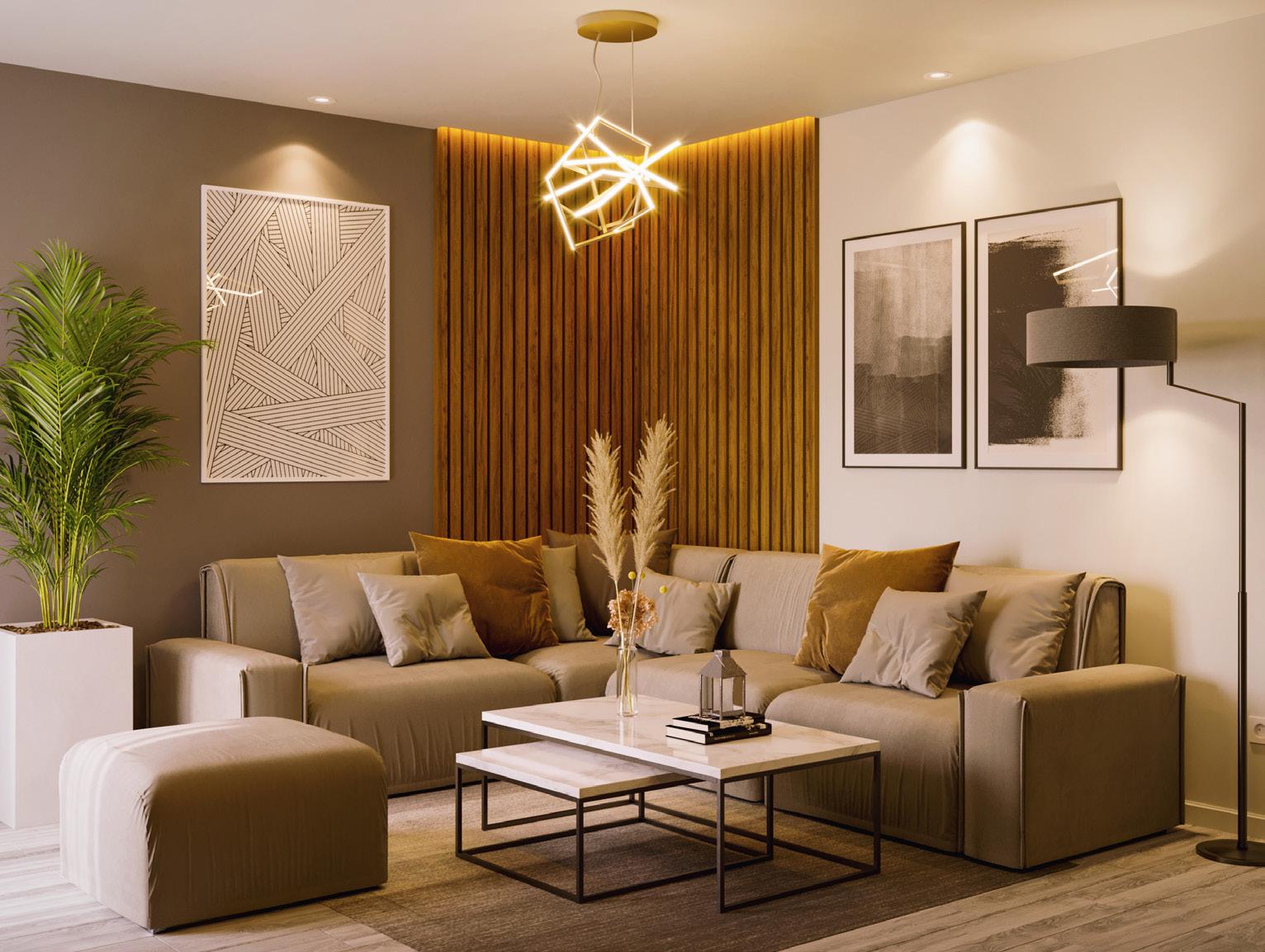 Un séjour familial ouvert sur le hall avec une sépara tion géométrique en bois beige et canapis gris claire ccontrasté par des cousins et spot noir et mur TV gris foncé tout en adouçant l’espace avec une plante.