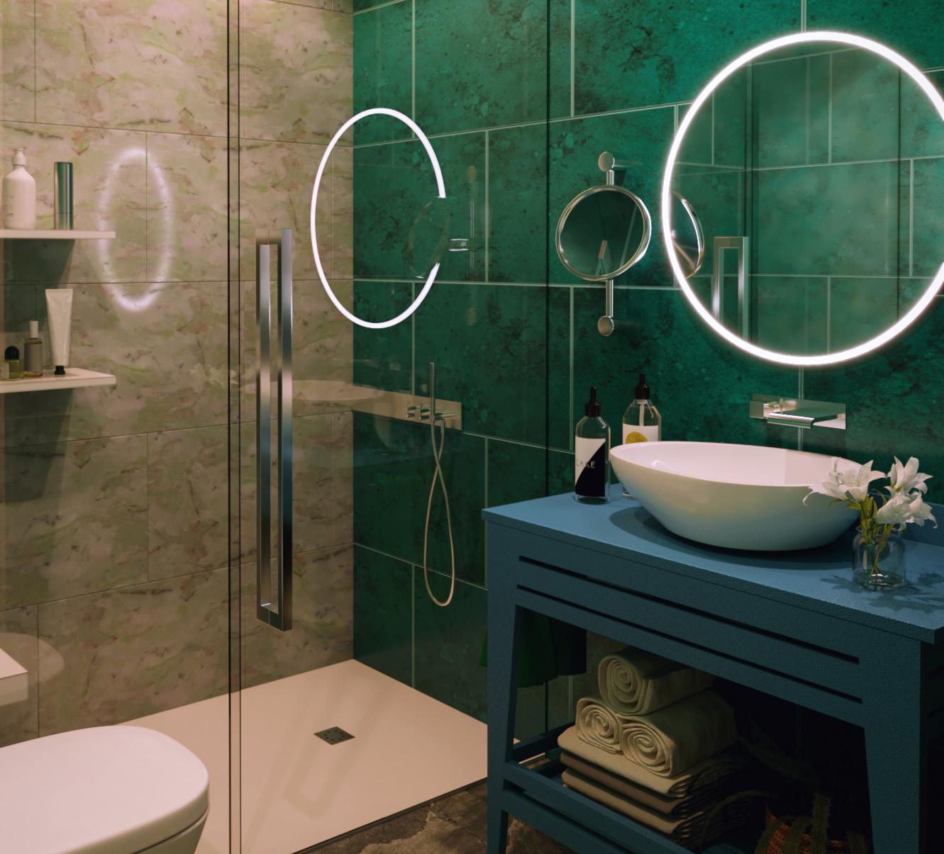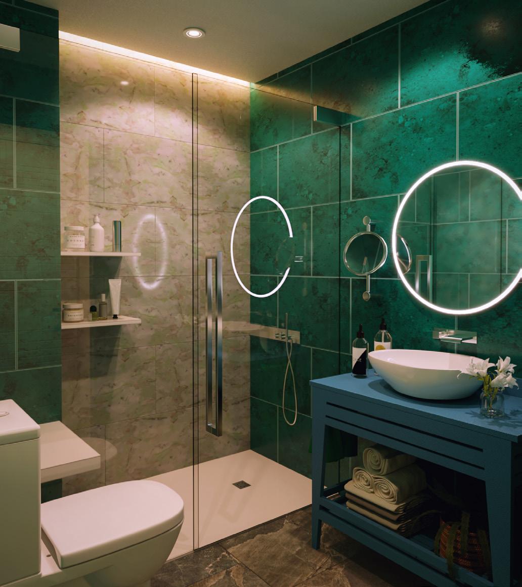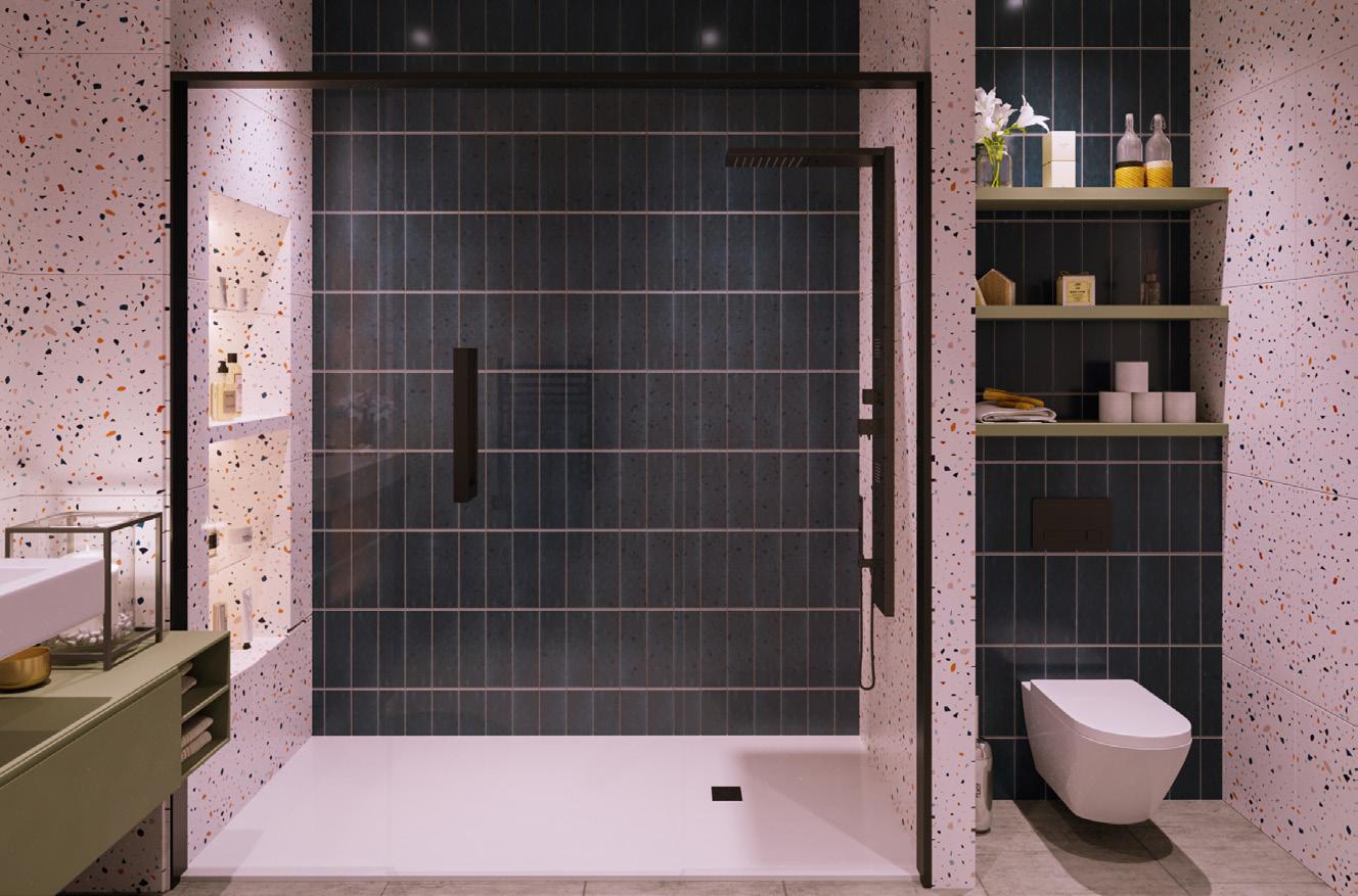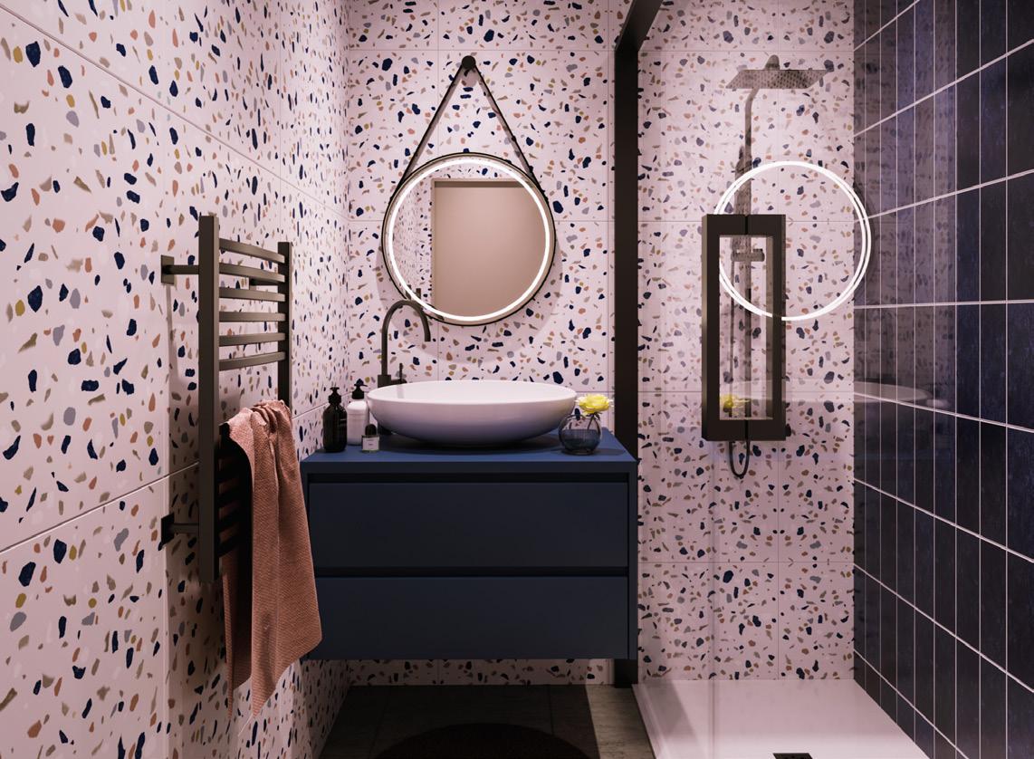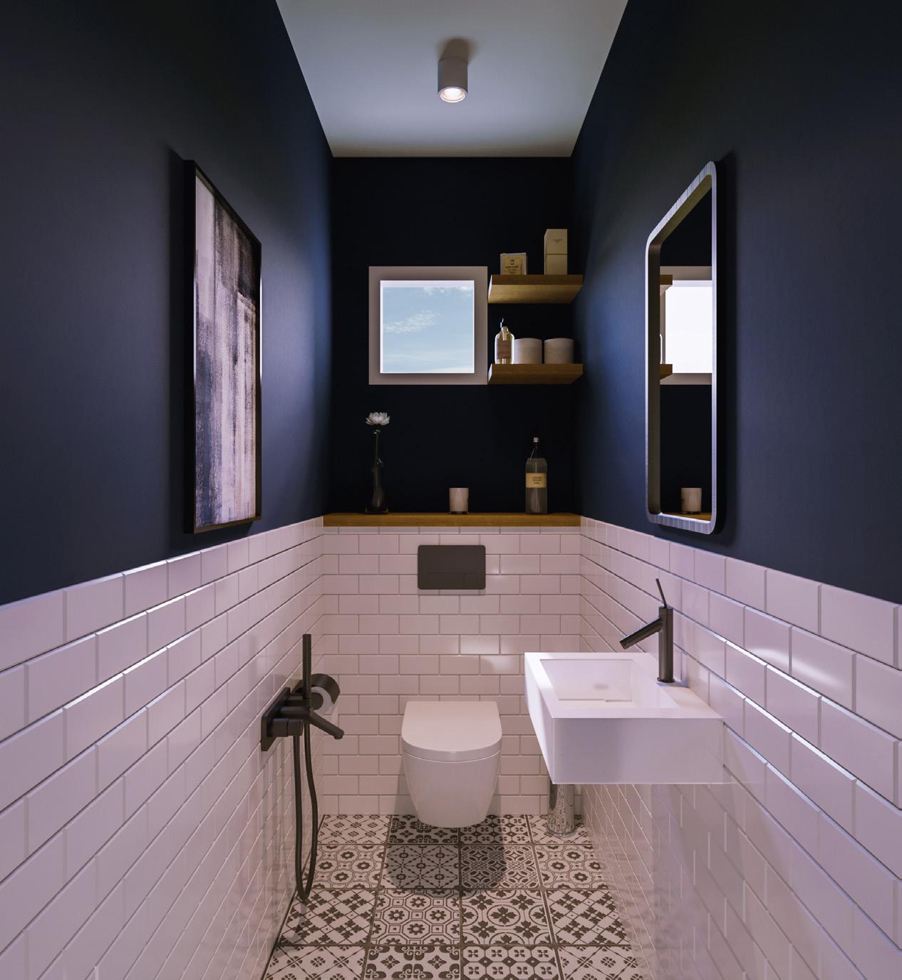 La S.D.B est faite de terrazzo blanc, cantrasté par un céramic bleu pour un mood paisible et calme sans oublié le robinet et le cadre de mir roir en noir pour une petite touche d’élégance.