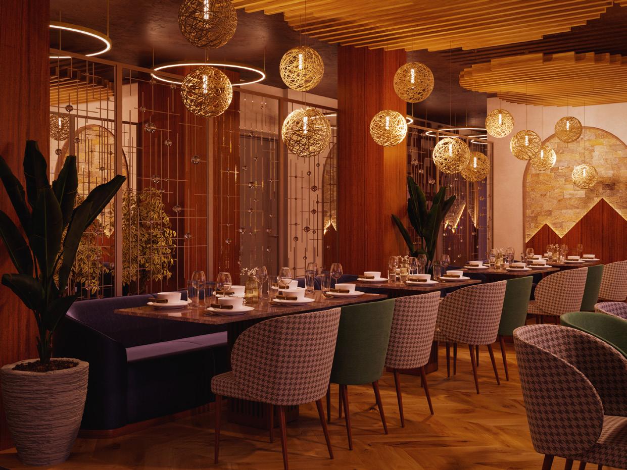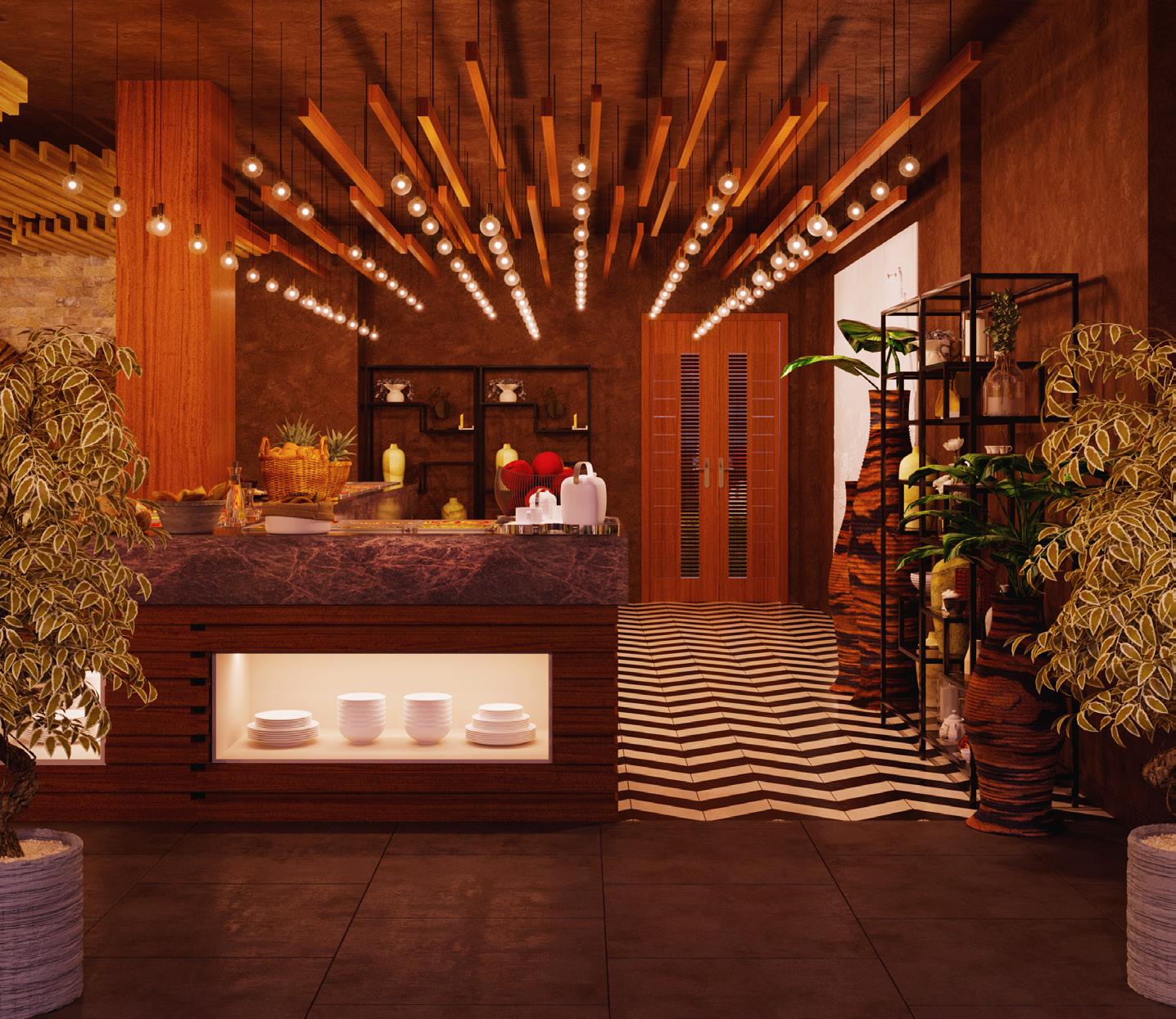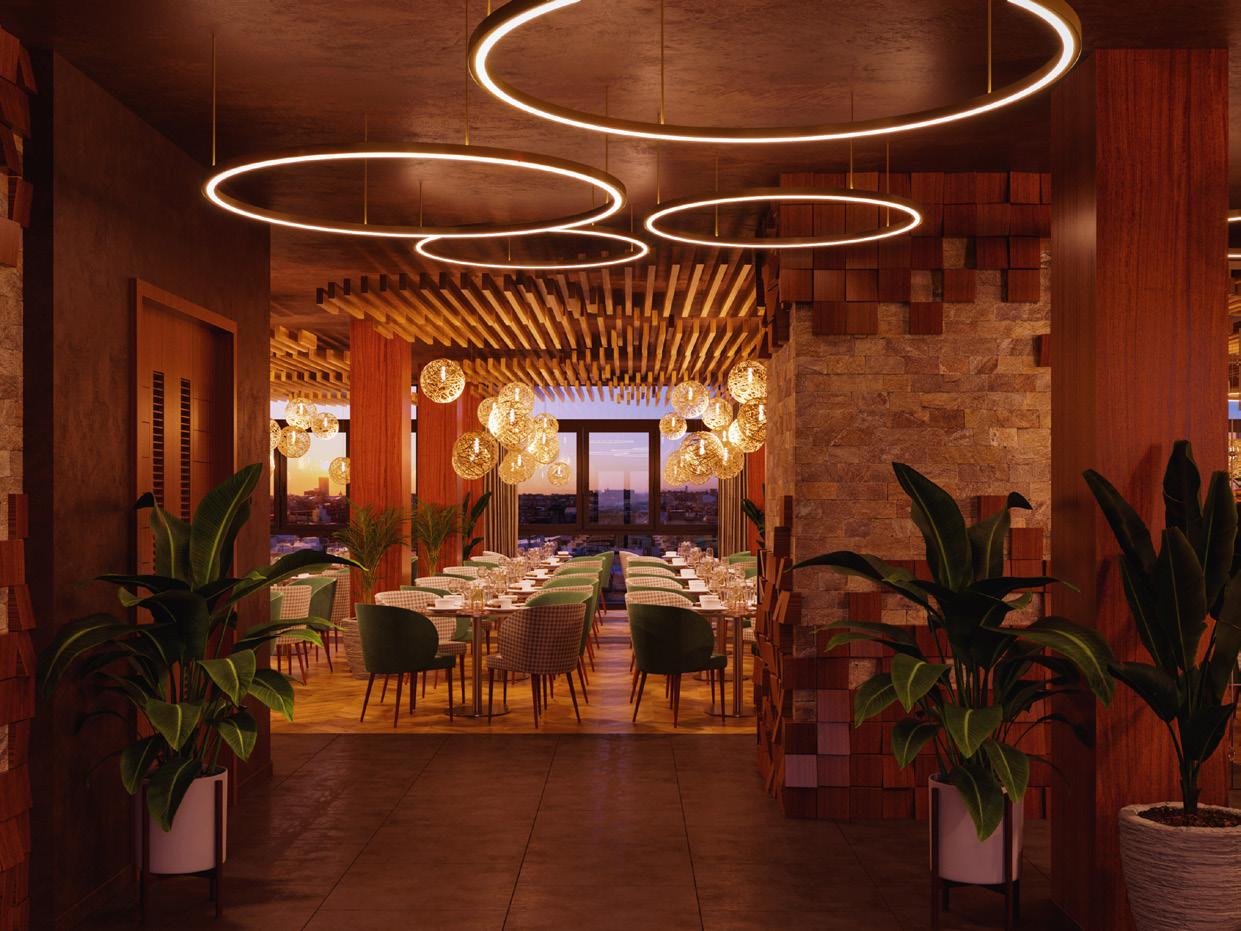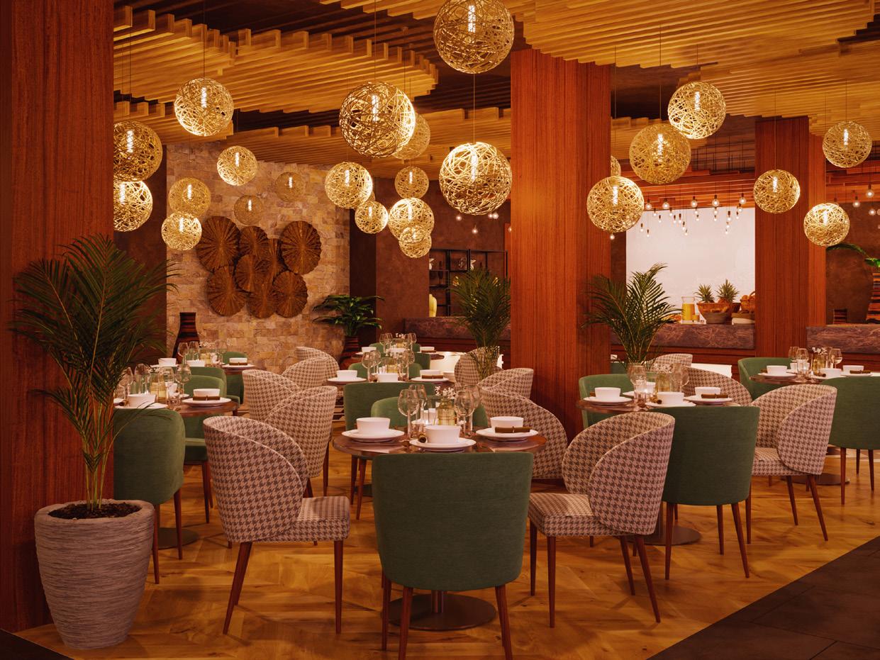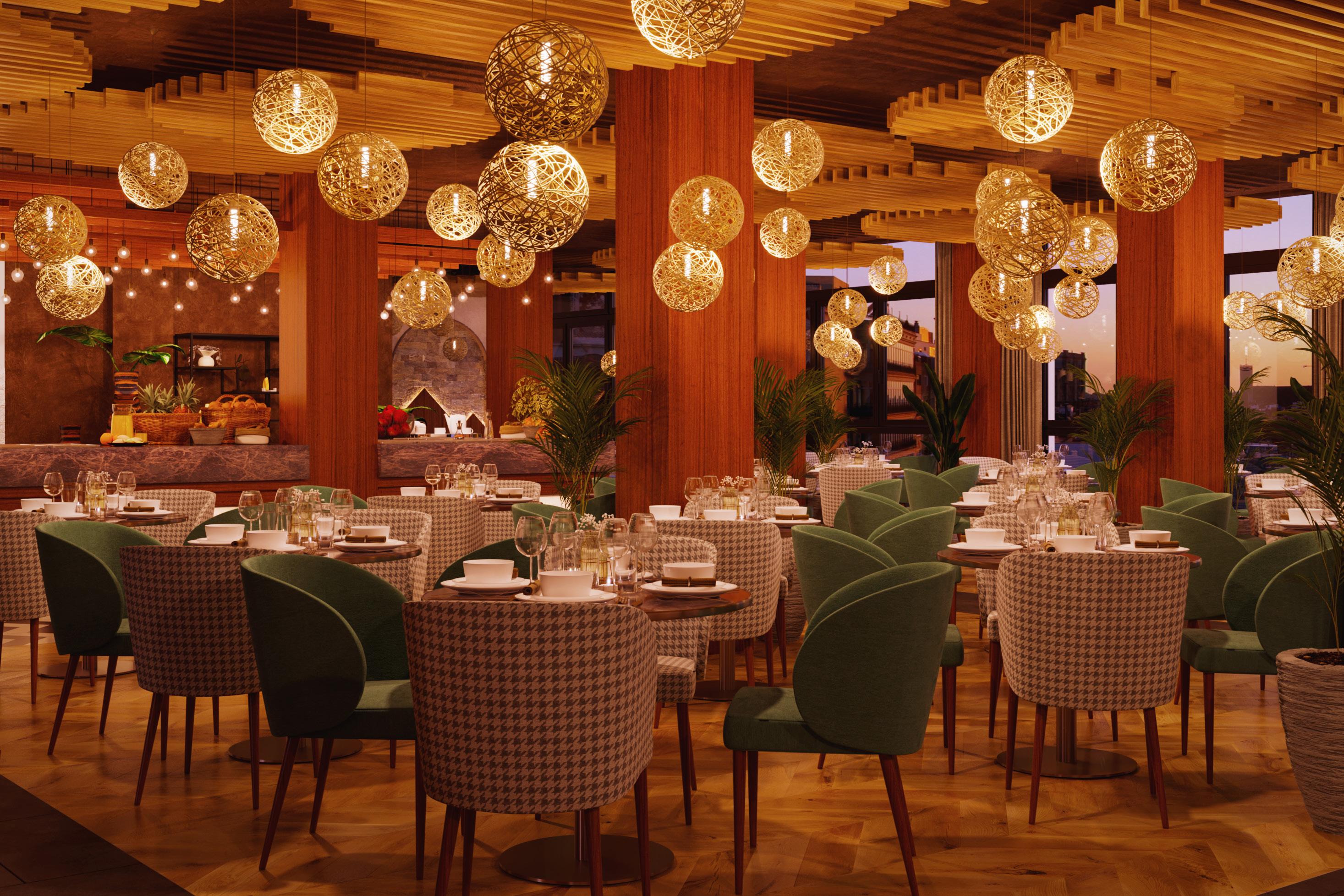 Le restaurant est de superficie de 338.64 m 2 avec 153 places et un buffet, une ambiance chaude et de nature, élégante avec des textures naturels et des matériaux locaux comme le bois; la pièrre; et des arc rapplants les montagnes de la kabylie en dos du l’hotel avec une nuance marron qui ouvre la pétie avec quelque plantes. Il reste juste a vous que vous êtes les bienvenue à la Kabylie.