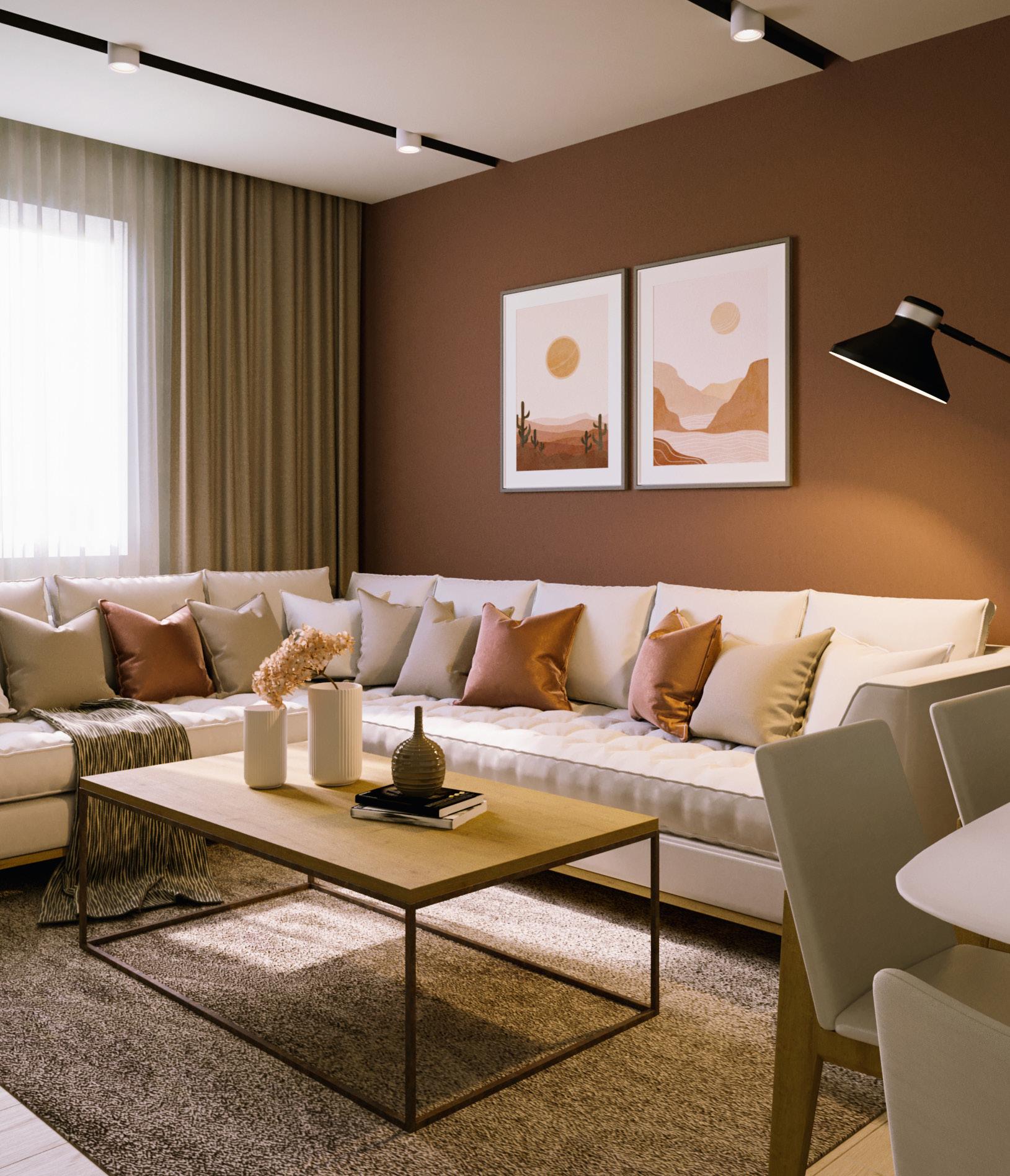Un séjour chaud et confortable avec un mur rouge brique et accessoires com me tableau et coussins, pour une force d’émotion, une détermination, renforcer la personalitée de l’espace.