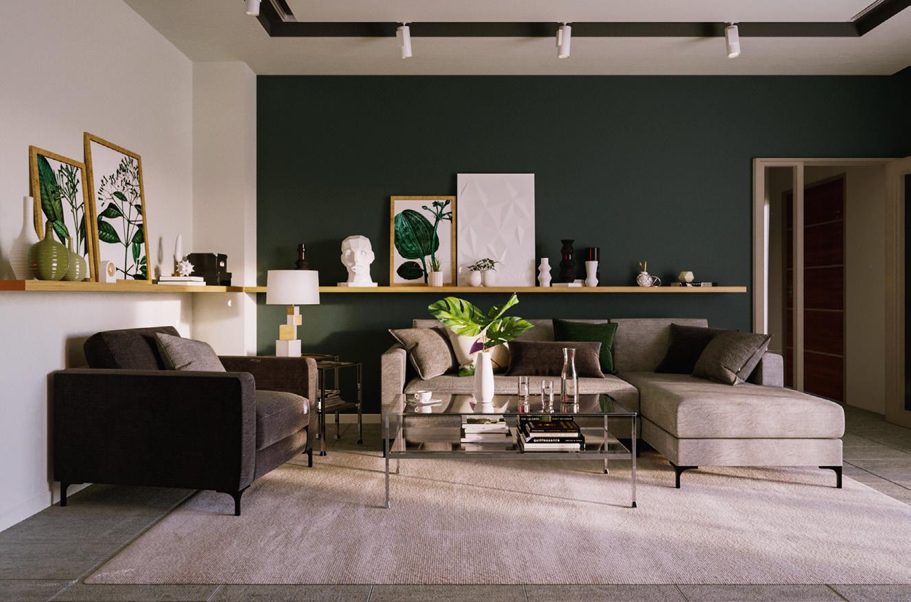 Un séjour cantrasté entre mur blanc neutre et mur vert comme le can apé avec le fauteuil et les cousin entre le gris claire et le noir pour appoeter un espace calme et une relaxation mental et physique.