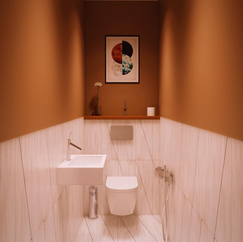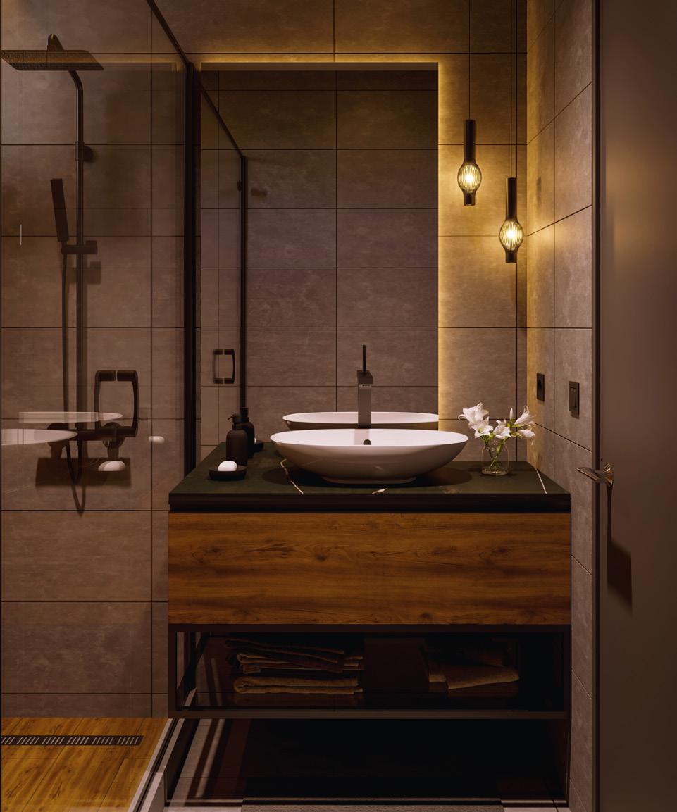 La S.D.B suite comme ses prédéces seur avec des careaux de porcel ine en texture de béton gris comme le W.C en cantrastant pour le mur de douchette une texture boisé marron pour un effet chaud et confortable, le hall rest neutre en blancheure avec des tableau et un éclairage en noir.