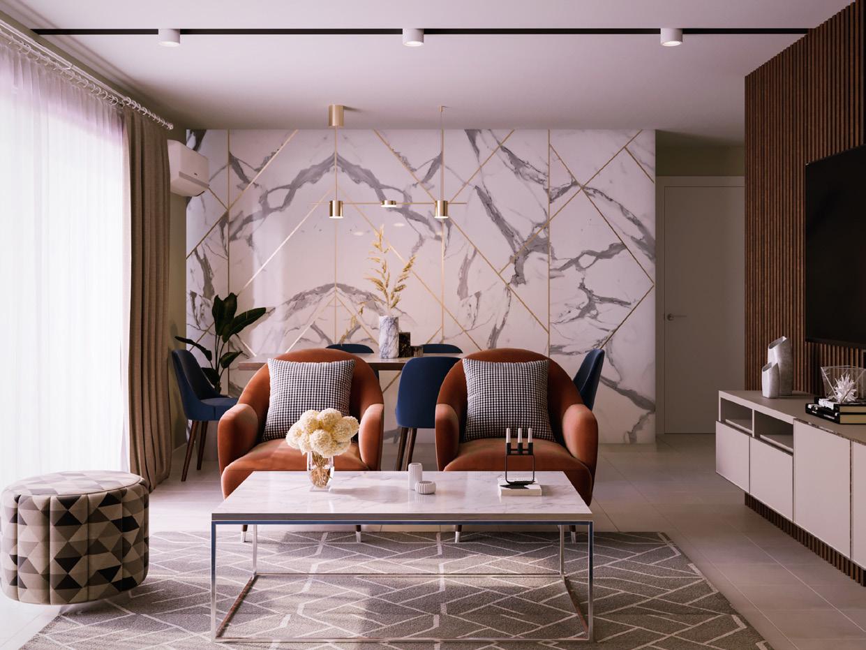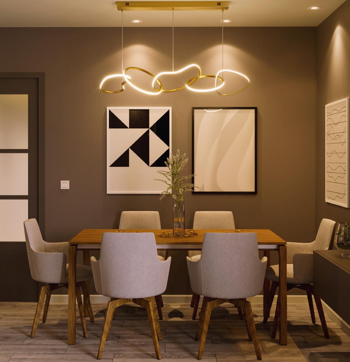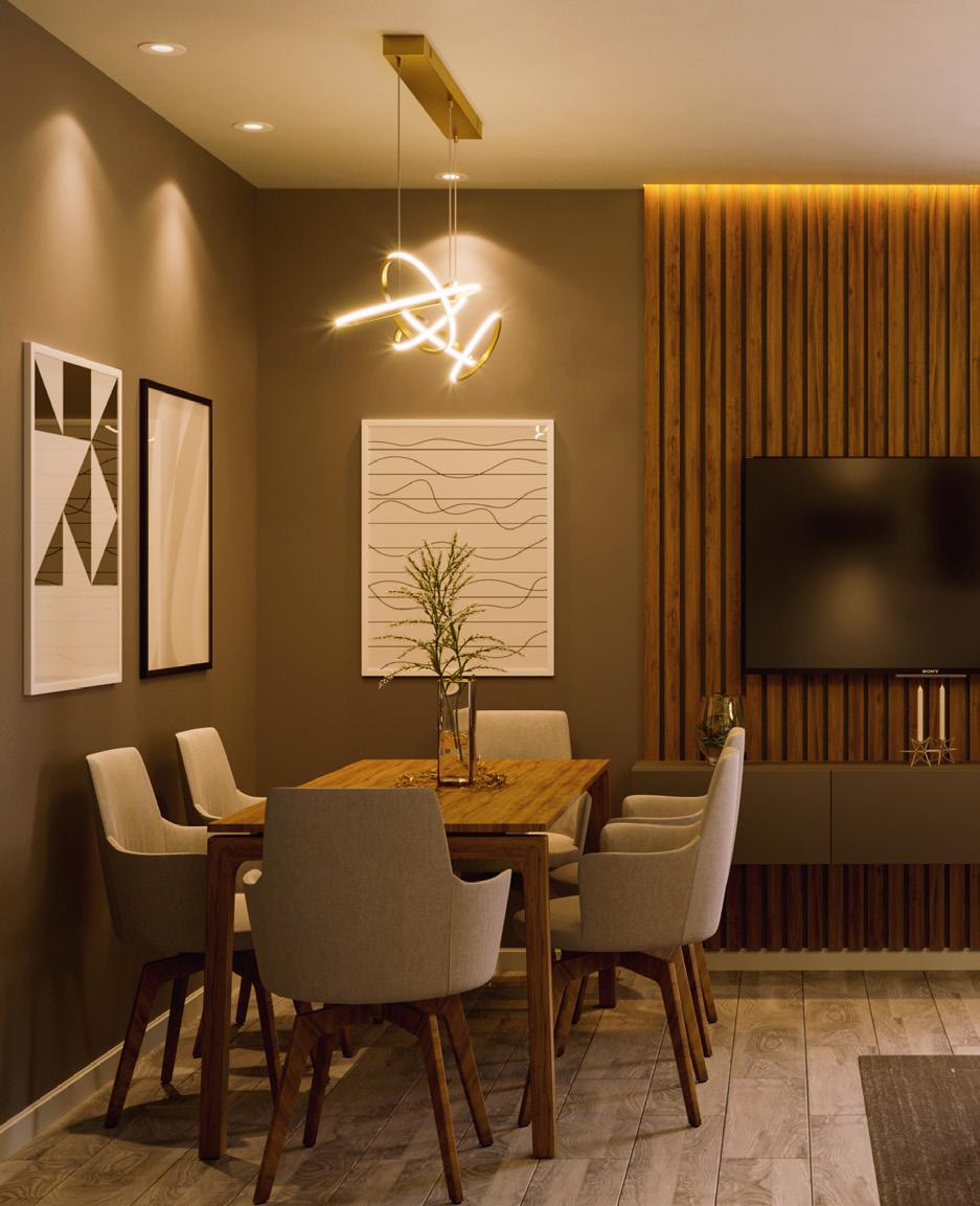 Le séjour et salle à manger texturé par des baguettes en bois verticale et mur gris taupe foncé cantrasté par des tableaux et table base en nuance blache donne a l’espace un aspect calme; appaisant et élégant.