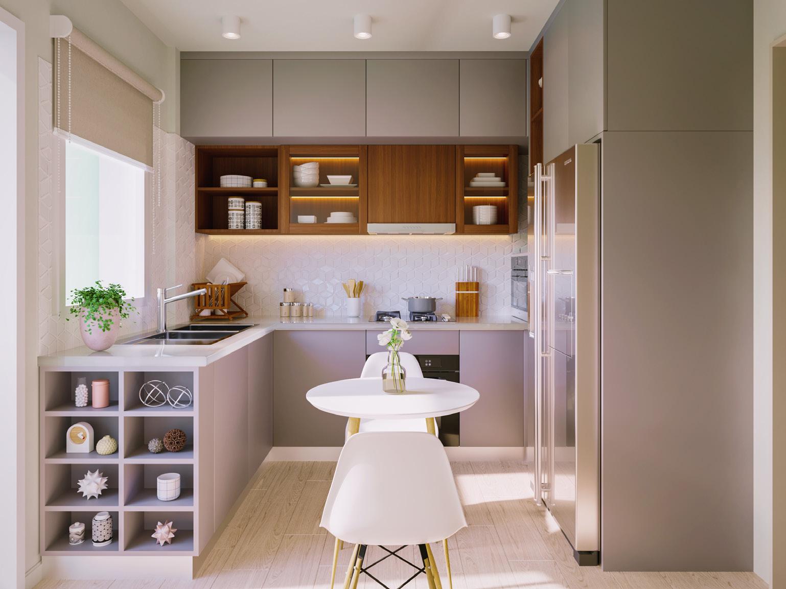 La cuisine est un mood d’émo tion et sophistiqué avec gris claire taupe et bleu claire en ajoutant quelque texture naturel tel que le bois pour la les éléments et la séparation et la pièrre et les plantes