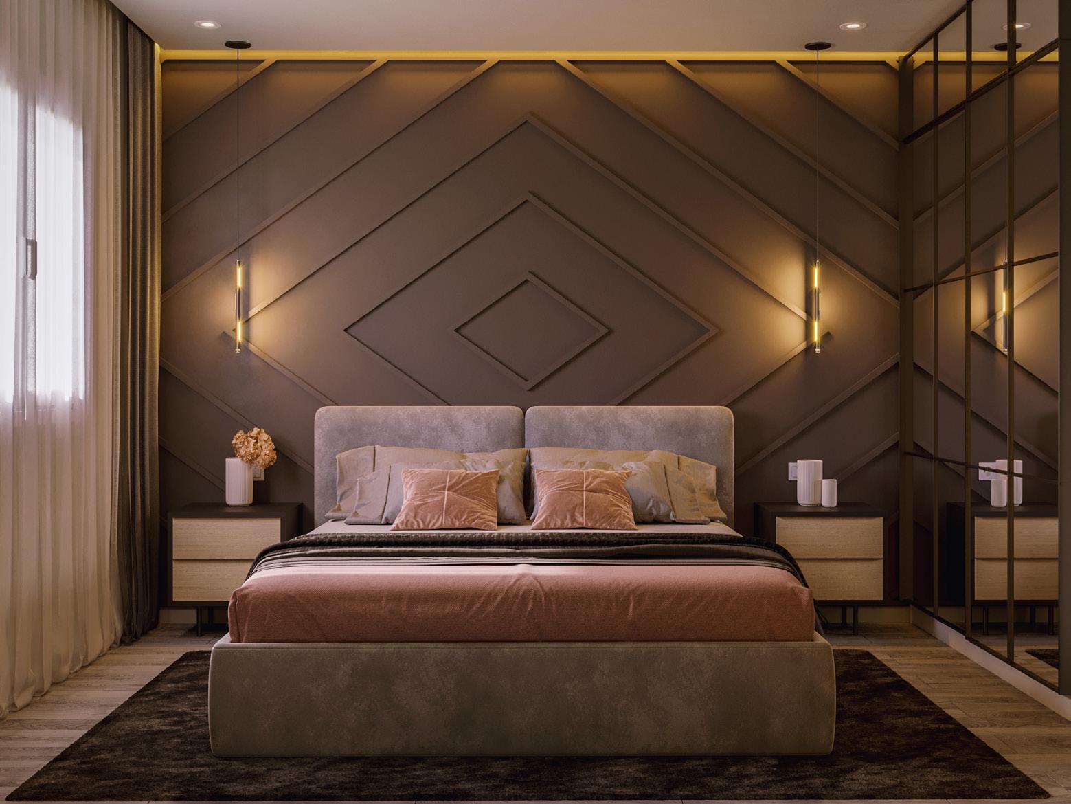La chambre parentale est décorée par un mur géométrisé en losange en gris taupe foncé et une armoire en caré de métale noire pour un as pect d’élégance en adouçant avec une litterie rose claire et une plante.