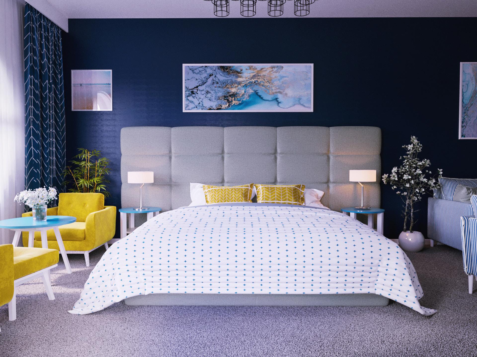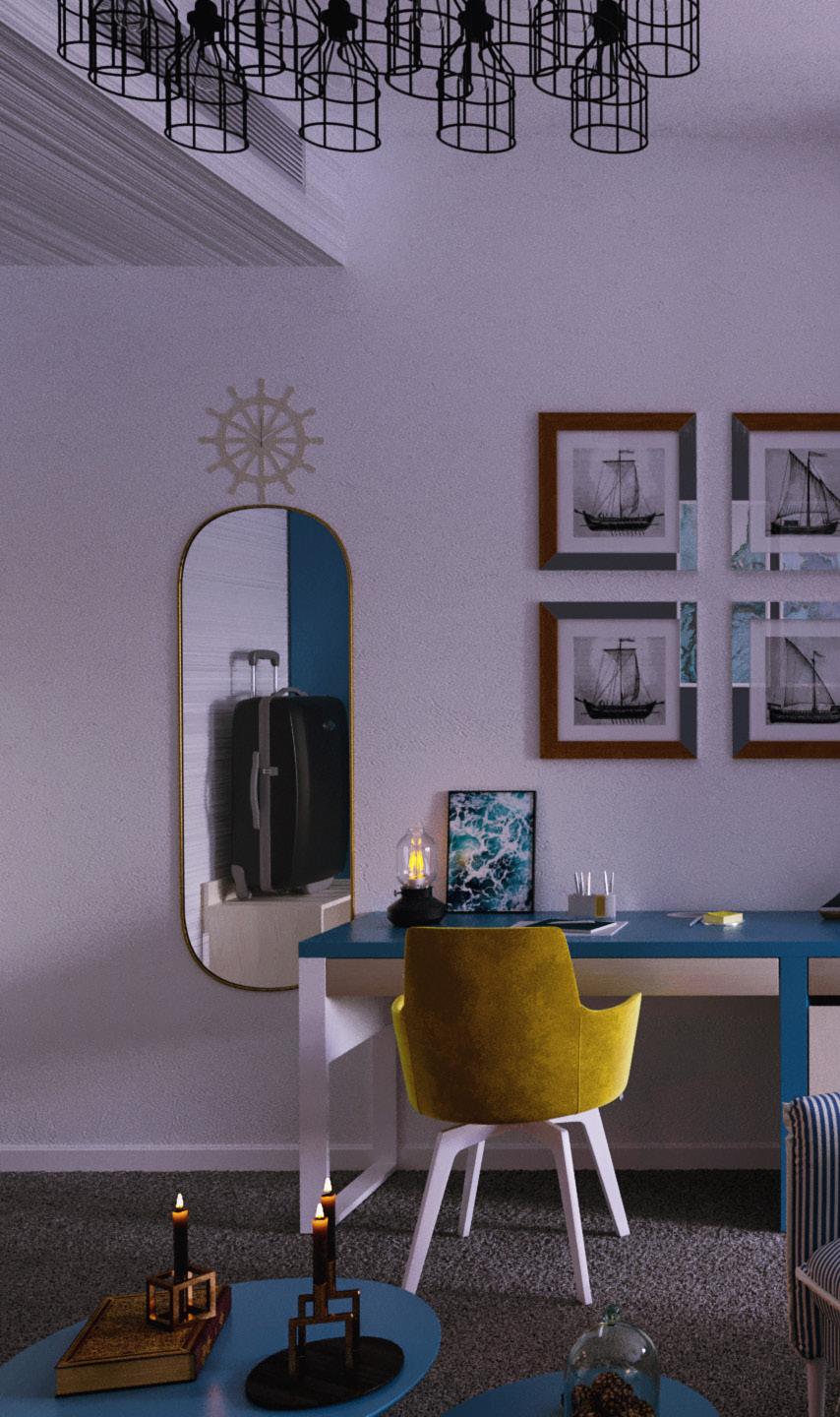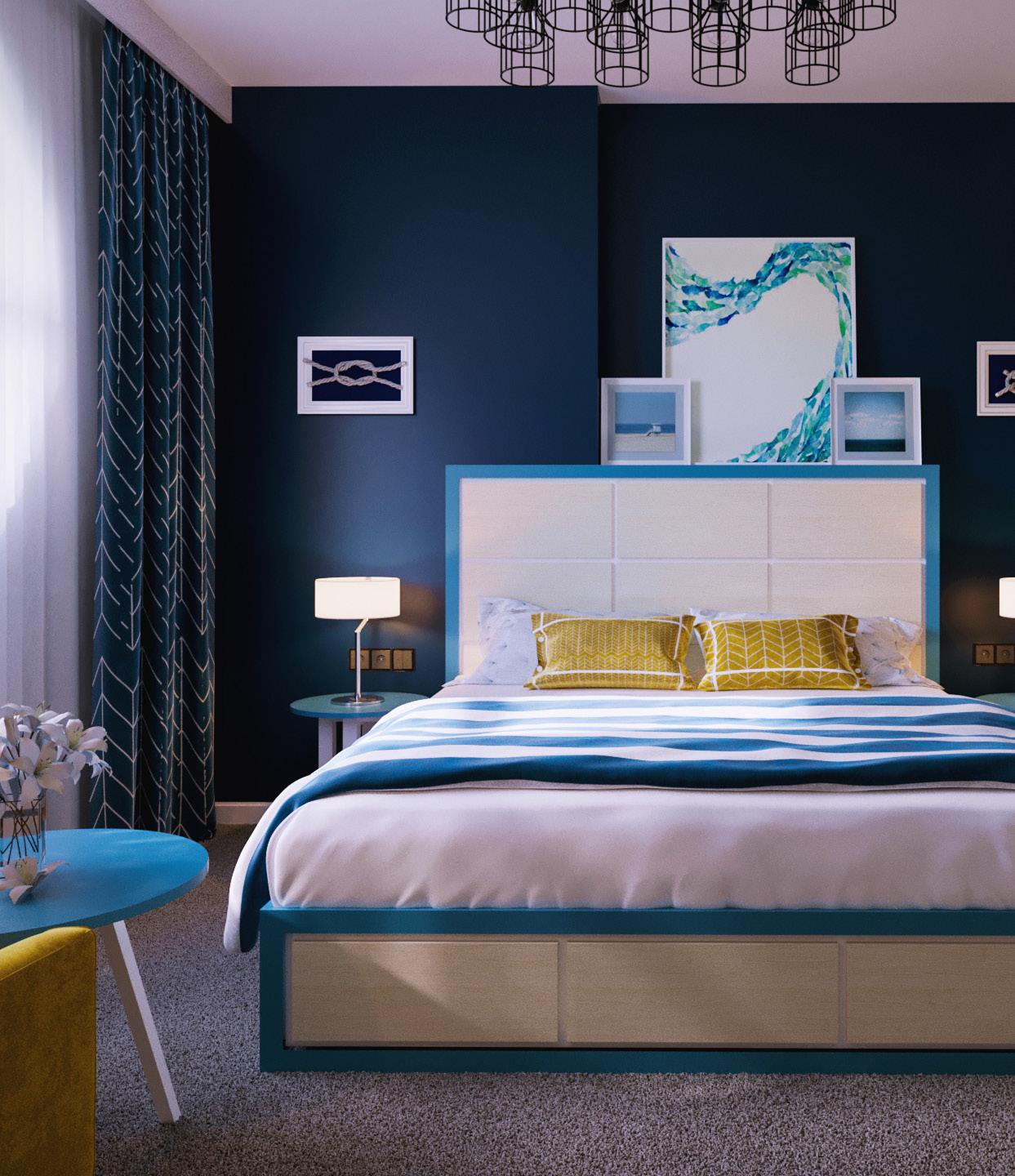standard et la suite, on une ambiane paisible, des nuance de bleu pour et quelque élements de meuble et cantrasté par le jaune du sable pour le chaises et les fauteils, tous a ce que clients pour se détendre dans air de mer.