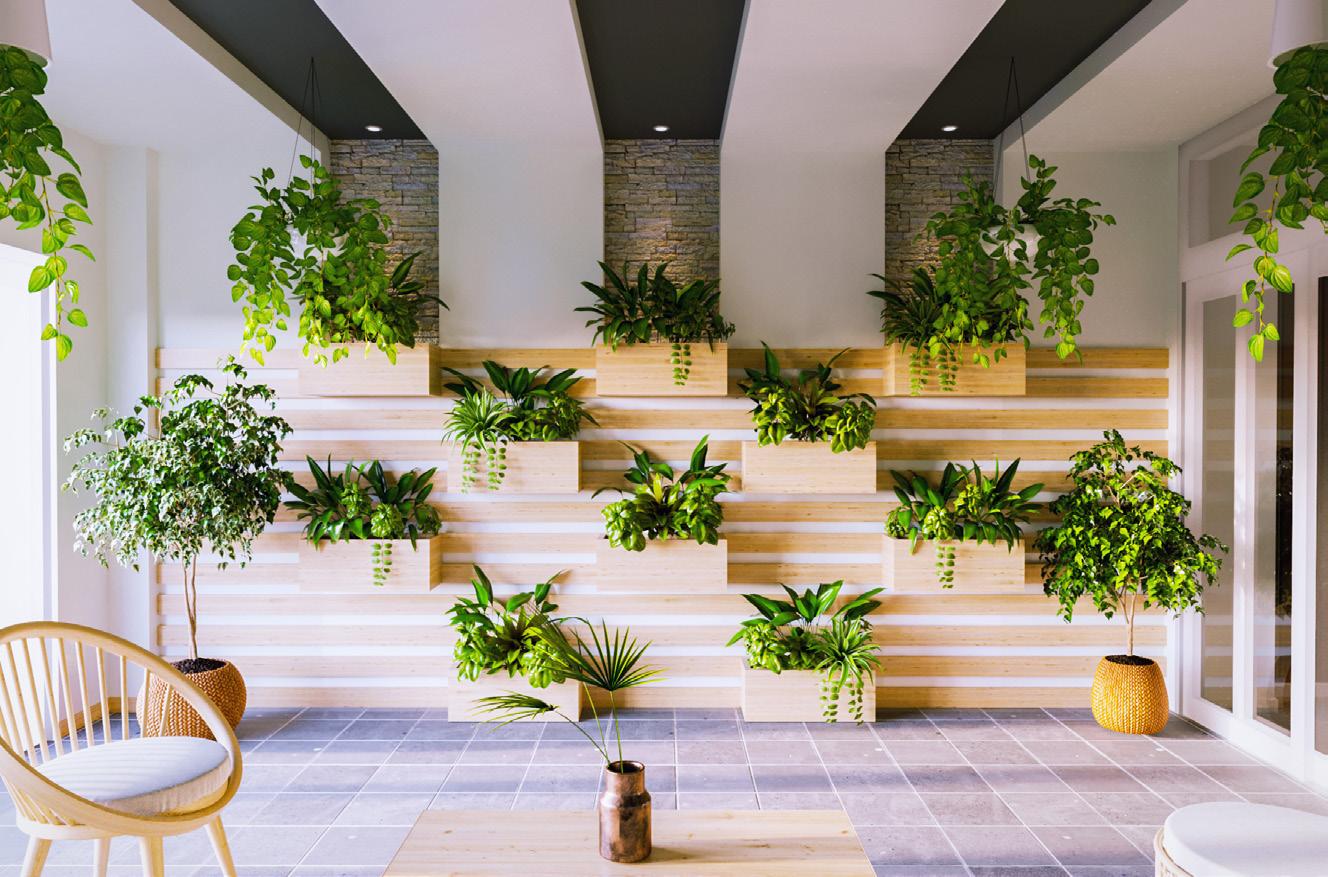 Un jardin d’hiver attrayant et col oré par des plantes et avec des textures de pièrre et de bois beige pour rendre l’espace plus paisible; frais et naturel.