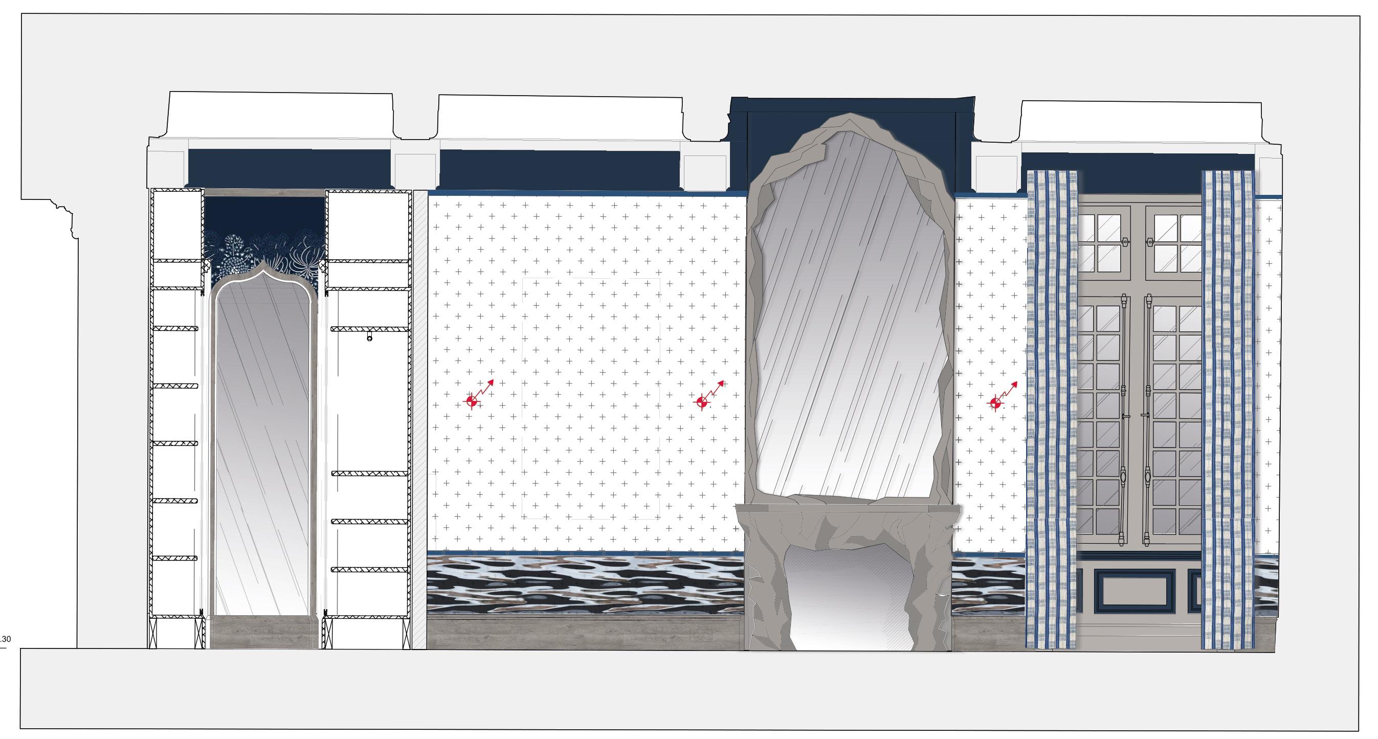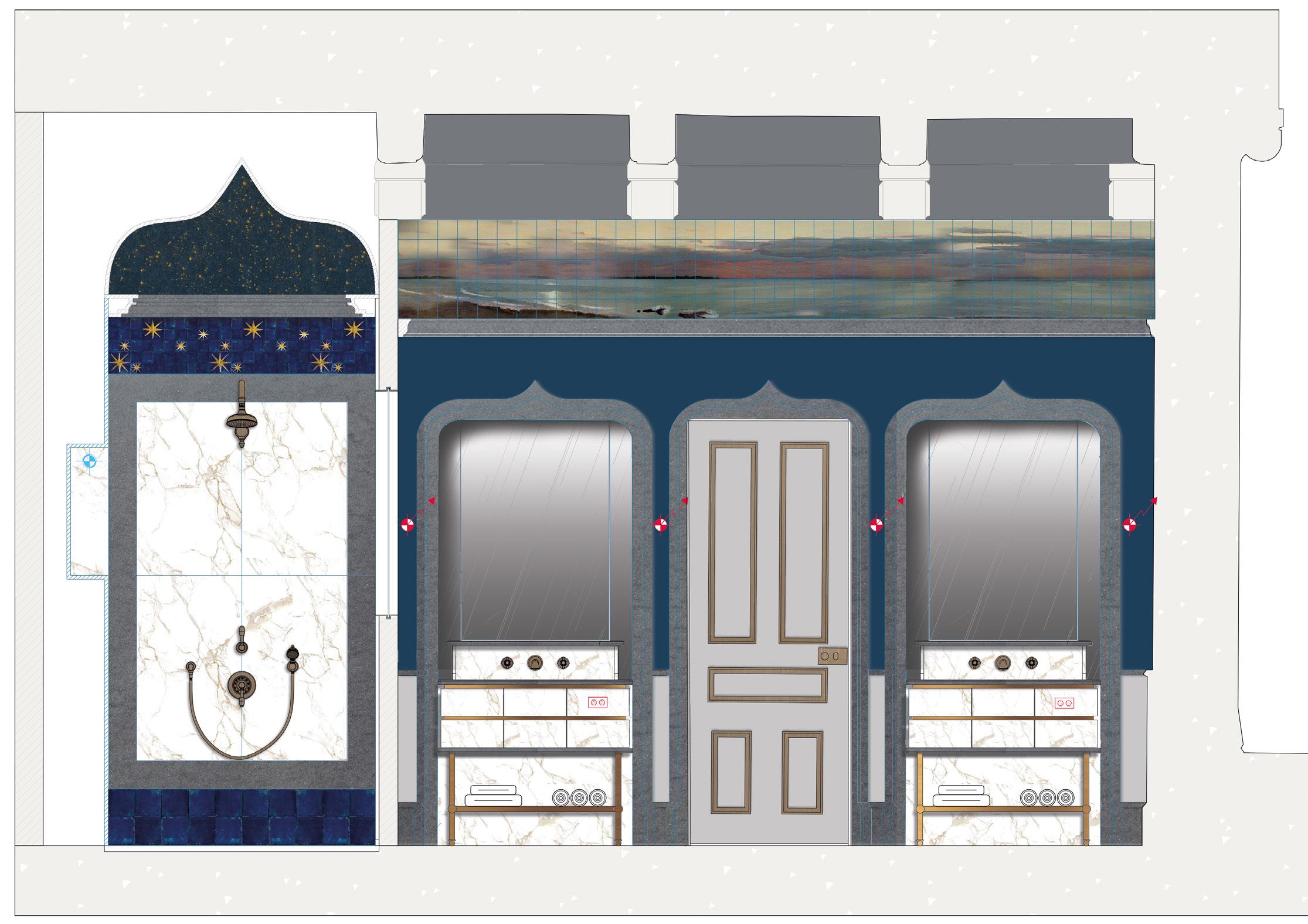 C’est un château sur 4 niveaux dans la Normandie qui donne sur mer avec un rez-de-jardin et un RDC ou on trouve les espace jour tel que séjour bibliothèque, cuisine en plus du 1er et 2eme étage ou on trouve les espaces nuits les chambres, il s’appelle Chateau Gabriel issue des romans de Marcel Proust concernant la famille de Guermantes ou les espaces sont nom mé par rapport aux noms du personnage du roman. Comme le château contient beaucoup d’espace, on va trouver la master bedroom et la master bathroom avec un détail d’exécution du meuble S.D.B