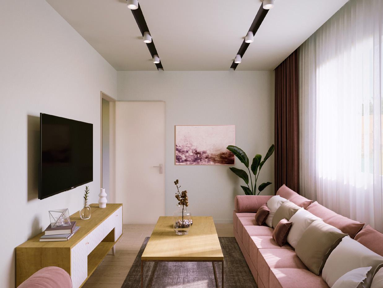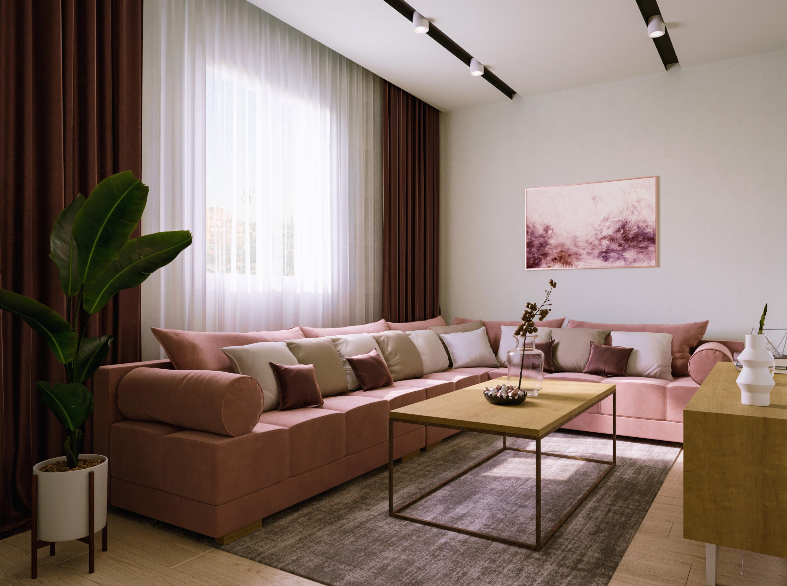 Le séjour familial est atunué en rose couleur de l’amitié et d’amour pour des asemblement de la famille conviiable et de calme, acouplé avec un meuble de bois beige et adoucit par une plante.