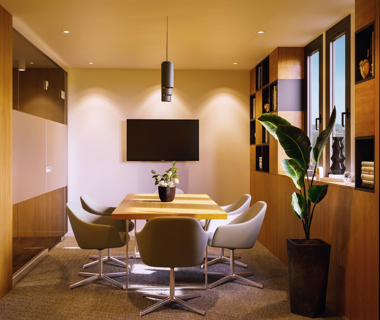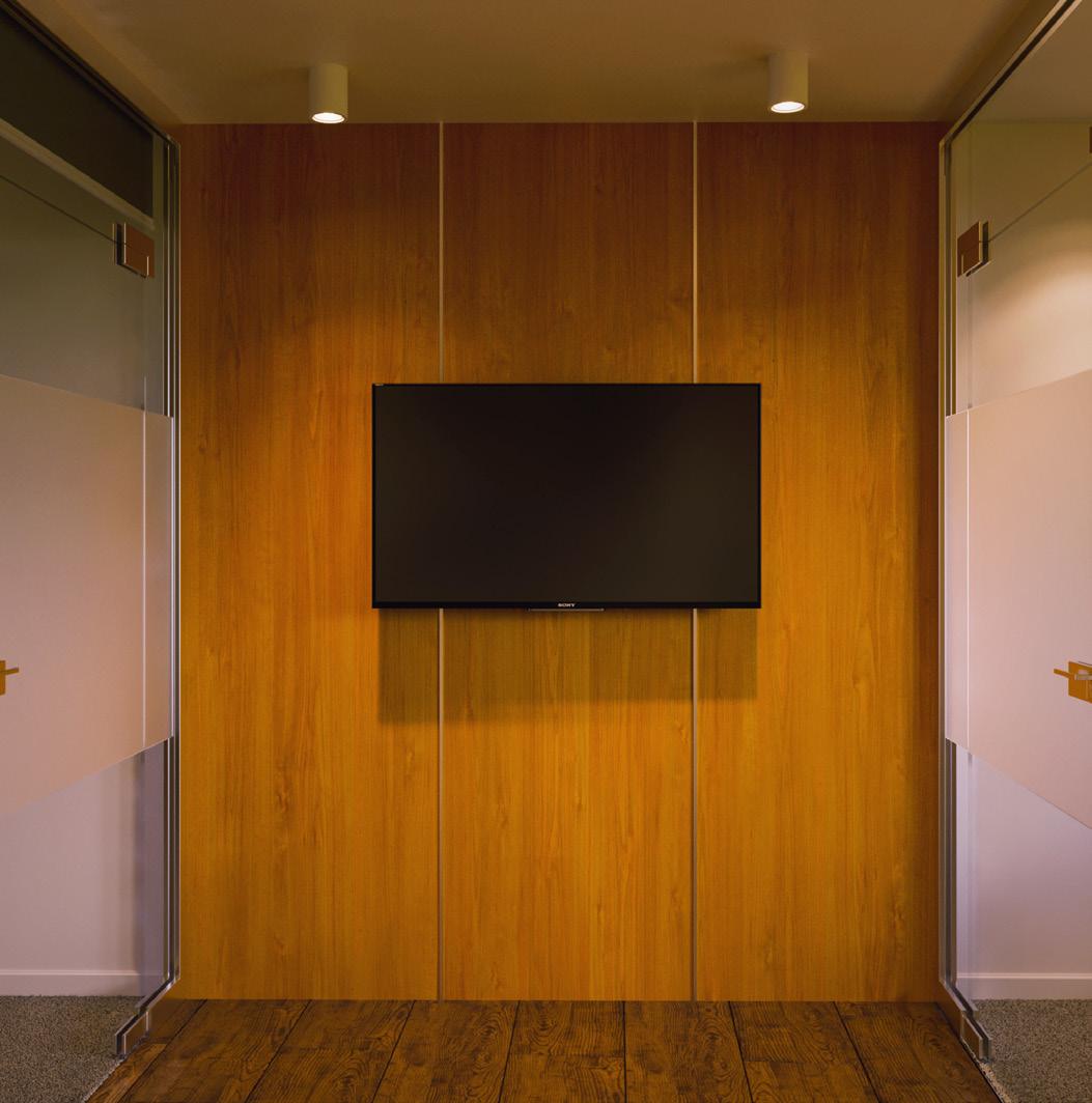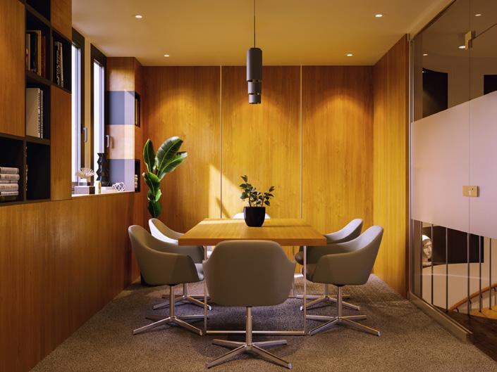 La salle de réunion est de meme que le RDC une continuité du bois orange pour une ambi ance appaisante et enthousiaste et de créativité, c’est de cette espace que sort les idées, le bureau de directeur est une texture wengué foncé, élégante; neutre et calme.