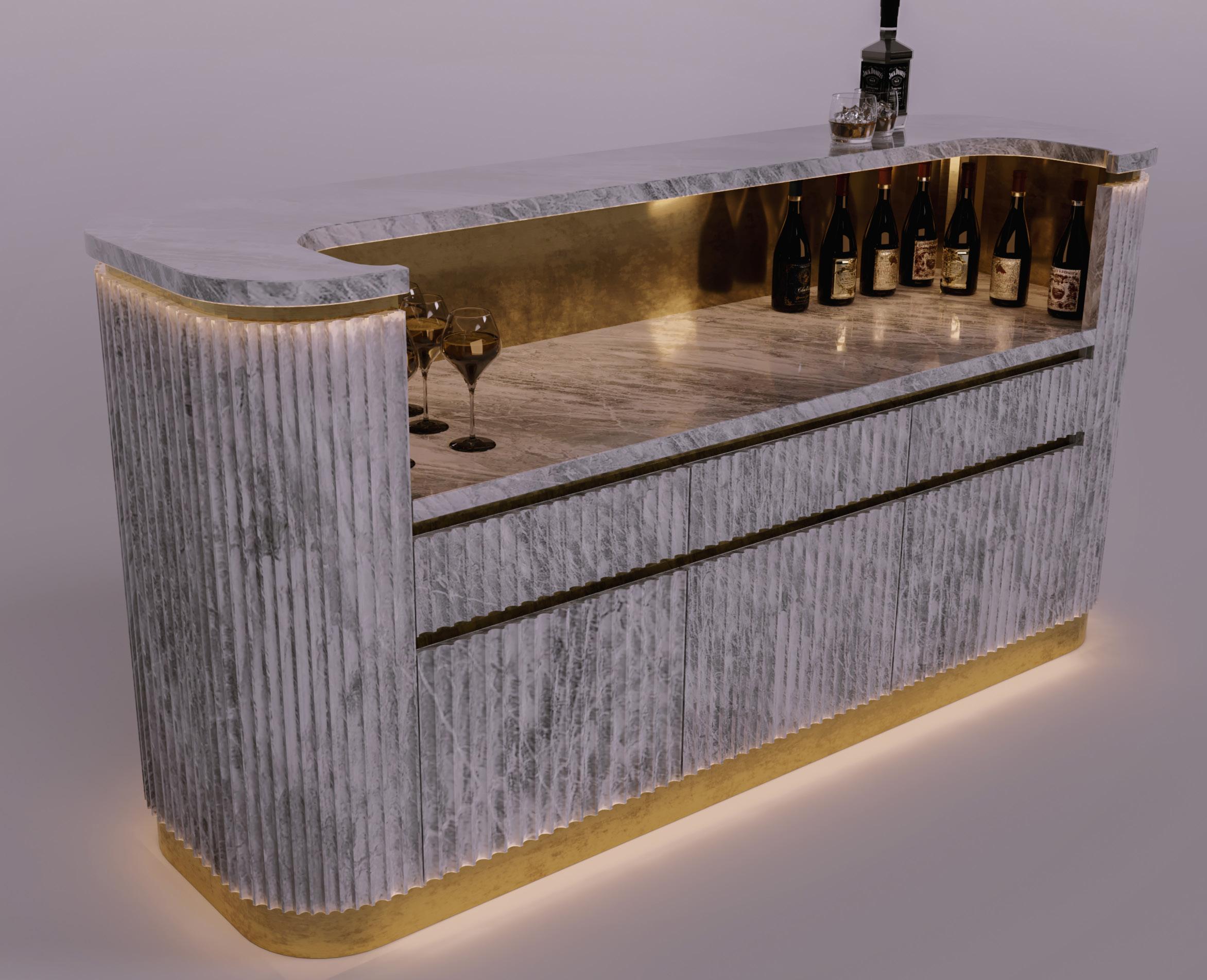 C’est un mobilier de Bar dans une résidence à l’Inde une forme de rect angle chanfreiné dans les bords pour douceur tout en gardant un aspect néoclassique avec des cannelures en marbre sur les façades.