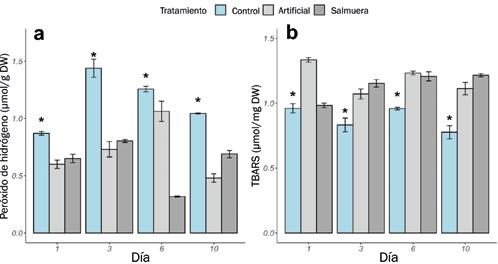 Contenidos de peróxido de hidrógeno (H2O2) y (b) sustancias reactivas al ácido tiobarbitúrico (TBARS) en hojas de P. oceanica bajo tratamientos experimentales de salinidad: control (37 psμ), Sales artificiales (43 psμ) y salmuera (43 psμ) en cuatro momentos de muestreo (días 1, 3, 6 y 10). Las barras representan la media de cada variable con sus respectivos errores estándar (SE). Las letras mayúsculas representan diferencias significativas con un intervalo de confianza del 95% (p < 0,05) entre días. Los asteriscos (*) indican diferencias significativas entre tratamientos.