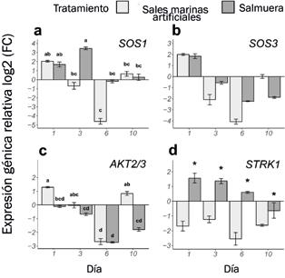 diferentes de exceso de salinidad, mediados por sales artificiales o salmueras de desalinización. Los genes medidos fueron SOS1 (a); SOS3 (b), AKT2/3 (c), y STRK1 (d). Las letras mayúsculas representan diferencias significativas con un intervalo de confianza del 95% (p < 0,05) entre los días (1, 3, 6 y 10). Las letras minúsculas representan diferencias significativas entre grupos cuando la interacción entre factores fue significativa. Los asteriscos (*) indican diferencias significativas entre tratamientos