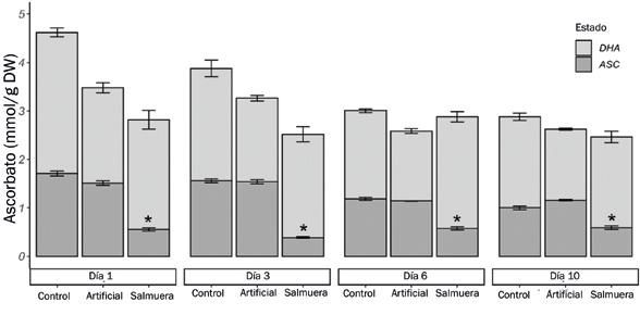 Las plantas de ambos tratamientos de hipersalinidad mostraron valores de ascorbato total inferiores a los de los controles. Aunque la concentración de ascorbato en su estado oxidado (DHA) no mostró diferencias entre tratamientos, su concentración en estado reducido