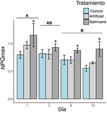 La extinción no fotoquímica (NPQ) en las hojas de P. oceanica bajo tratamientos experimentales de salinidad: control (37 psμ), Sales artificiales (43 psμ) y salmuera (43 psμ) en cuatro momentos de muestreo (días 1, 3, 6 y 10). Las barras representan la media de cada variable con sus respectivos errores estándar (SE). Las letras mayúsculas representan diferencias significativas con un intervalo de confianza del 95% (p < 0,05) entre días. Los asteriscos (*) indican diferencias significativas entre tratamientos.