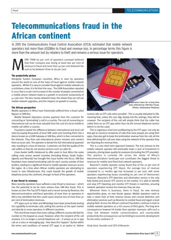 normal calls as OTT calls when possible’. This is usually defaulted to ON, meaning that, unless the user digs deeply into the settings, they will be unaware. The recipient of the call will simply think that the caller has called them on an OTT app rather than via the normal telephone service (which is not the case). This is ingenious short term profiteering by the OTT apps: not only do they get to convince recipients of calls that more people are using their apps, they also get to keep the termination revenue from the call, all the time delivering this call over data using the network of the operator they are hijacking the revenue from. This is a very short term approach however. The lost revenue to the mobile network operator will eventually mean a lack of investment in networks, driving down quality for everyone (including the OTT provider). This practice is currently rife across the whole of Africa’s telecommunications landscape and constitutes the biggest threat to revenues for mobile (and fixed line) network operators. Revector’s mobile operator survey found that of the 70 per cent of operators experiencing OTT hijack, the average loss of revenue compared to 12 months ago has increased 21 per cent, with some operators experiencing losses exceeding 60 per cent of interconnect revenues. Revector’s OTT detection and elimination service is the only fully tested and proven OTT service on the market. It is able to identify and stop OTT hijacking and monitor OTT threats in real-time, ensuring network operators receive the revenues they are due. Wherever there is business, there is fraud. As new revenue opportunities grow, so new frauds appear. Mobile operators need to take a closer look at their revenue losses and consult detection and elimination services such as Revector to combat fraud and regain a level playing field. Across the African continent fraudsters continue to look to mobile network operators as a rich source of illicit gains. The long term consequences however hit harder than operator revenues: with such a close link between mobile communications and country-wide productivity the consequences can be limiting to economic development for the entire continent. ✆