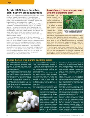 Record Cotton crop signals declining prices THE COMBINATION OF a record cotton crop and falling consumption will expand global stockpiles by the most since 2005, driving further declines in the price of this year's worst performing commodity. Harvests will increase 7.5 per cent to 123.89 million 480-pound bales (27 million tonne) in the 12 months ending in July, as demand drops to a three-year low of 114.27 million bales, the US Department of Agriculture (USDA) estimates. Prices may decline 15 per cent to 77 cents a pound on ICE Futures US in New York by the end of next year, from 90.91 cents now, based on the median of 12 analyst estimates compiled by Bloomberg. “It's a double whammy,” said James Dailey, Output is rising from Australia to China to India, more than compensating for a US decline