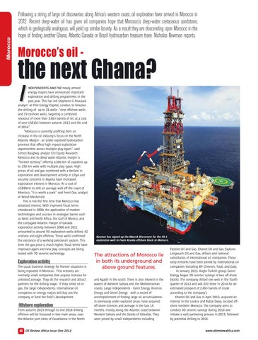 The attractions of Morocco lie in both its underground and above ground features. and Agadir in the south. There is also interest in the waters of Western Sahara and the Mediterranean coasts. Large independents - Cairn Energy, Kosmos Energy and Genel Energy - with a record of accomplishment of finding large oil accumulations in previously under explored areas, have acquired off-shore licences and acreage in the last 18 months, mostly along the Atlantic coast between Western Sahara and the Straits of Gibraltar. They were joined by small independents including