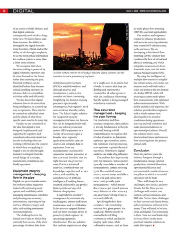 Flow assurance management – keeping the pipe flowing For production and flowassurance engineers, data analysis is already fundamental to the job, from well testing to field characterisation. It requires a lot of what-if analysis to determine optimum operational set points, like minimum water production, or to optimise required chemical injections. Nonetheless digital solutions can make a big difference. The problem here is primarily with the hardware. Subsea meters typically consolidate a number of measurements; certain metering types, like manifold mount meters, are not always available at every well; and subsea flow meters only provide point measurements – which means discrepancies get missed, just one meter failure can affect accuracy and analysing evolving trends is extremely difficult. Specifying the best flowassurance, risk-monitoring solution for a given project is a tough ask. Meters need to be selected before drilling commences, which can lead to lengthy cycle times, while radioactive sources, such as those