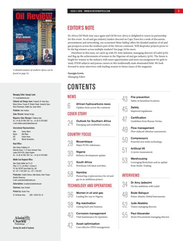 It’s Africa Oil Week time once again and Oil Review Africa is delighted to renew its partnership for this event. As oil and gas industry leaders descend on Cape Town for a week of discussion, presentations and networking, our economist Moin Siddiqi offers his detailed analysis of oil and gas prospects across the southern part of the African continent. Will deepwater projects prove to be the big winners across multiple markets? See page 24 for more. Elsewhere in this issue, we catch up with Dr Amy Jadesimi, managing director of Ladol (p34) and flag up the achievements of women in the Nigerian oil and gas industry (p34). The future is bright for women in the industry with more opportunities and more encouragement for girls to study STEM subjects and pursue careers in this traditionally male-dominated field. We look forward to more interviews with leading women in future issues of the magazine. Georgia Lewis Managing Editor