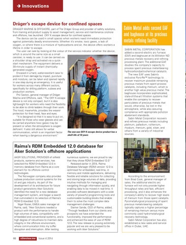 Dräger’s escape device for confined spaces DRÄGER MARINE & OFFSHORE, part of The Dräger Group and provider of safety solutions, from training and product supply to asset management, service and maintenance onshore and offshore, has launched OXY K escape device for confined spaces. The device can be used in small spaces when workers need immediate protection against potentially deadly environments. Whether it’s smoke, toxic gases, a lack of oxygen, or where there is a mixture of hydrocarbons and air, the device offers workers a lifeline in order to escape. The user can see by looking at the colour of the service indicator whether the device, which is around the same size as a small canister, is ready to use. It can be carried via a shoulder strap and activated via a quickstart mechanism. The equipment delivers a 30-minute supply of instant chemicallygenerated oxygen. Encased in a hard, water-resistant case to protect it from damage by impact, puncture and moisture, can be taken and opened rapidly in one step during an emergency. It is useful for workers across many different sectors, specifically for drilling platform, subsea and production workers. Phil Saxton, general manager of Dräger Marine and Offshore, said, “The OXY K escape device is not only compact, but it is also lightweight for workers who need the flexibility to be able to climb ladders through their work. The hood, meanwhile, provides the wearer protection for their head, face and eyes. “It is designed so that it is easy to put on, suitable for those who wear glasses and can be carried anywhere toxic gases may be present or when the atmosphere is oxygen deficient. It also still allows for verbal The one-use OXY K escape device product has a communication, which is an important factor shelf-life of 10 years when leaving a dangerous environment.”
