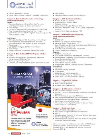 Category 5 – Best Oilfield Services Company (Local, Regional or International) Local • EMDAD LLC • EMDAD LLC Integrated Service Company • Megarme General Contracting Co. LLC • Best Oilfield Services Company - Inspection, Repair, Maintenance Utilizing Rope Access Solutions • Trizac Abu Dhabi, Oilfield Supplies and Services • 30 Years of Operational Excellence Regional • Gulf Drilling International • GDI: Towards Sustainability and Operational Efficiency • Narayana Expert Engineering, Industrial Inspection, Technology & Energy Consultancy (NeemTech) • Best Oilfield Services Company • Zamil Offshore Services Company • Offshore Fleet, Services Expansion & Quality Enhancement International • Halliburton • Halliburton - Solving Challenges • Schlumberger • Global Strength, Local Understanding • Weatherford Manufacturing and Services • Ahead of the Curve, Proudly Made in the UAE Category 6 – Young ADIPEC Engineer • Talha Ahmad, Saudi Aramco • Ali Al-Khatib, Saudi Aramco • Abubaker Saeed, Saudi Aramco Category 7 – Best Dissertation of the Year • Amar J. Alshehri, Stanford University • An X-ray CT Study of Multidimensional Imbibition in Dual Porosity Carbonates • Marzieh Riahinezhad, University of Waterloo • Can Copolymerization Kinetics Help Tailor Properties Of Poly (Acrylamide/Acrylic Acid) For Enhanced Oil Recovery? • Saif Al-Ghafri, Imperial College London • Phase Behaviour and Physical Properties of Reservoir Fluids Under Addition of Carbon Dioxide Category 8 – Best Practice Award • ADMA-OPCO, NDC, Nobel-Denton, LOC • New Rig Pre-loading Procedure on Difficult Location • BAPCO • Rapid Operational Excellence by Technology Assisted Governance • Petroleum Development Oman • Delivering Technical Integrity & In-Country Value (ICV) Through the In-Sourcing of Equipment Repairs Winners and runners-up will be announced at the ADIPEC Awards Gala Dinner, which is hosted by the Abu Dhabi National Oil Company (ADNOC) and takes place at Emirates Palace on 9 November 2015. n