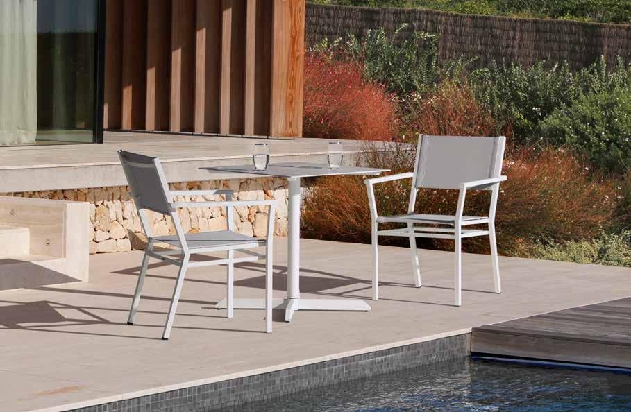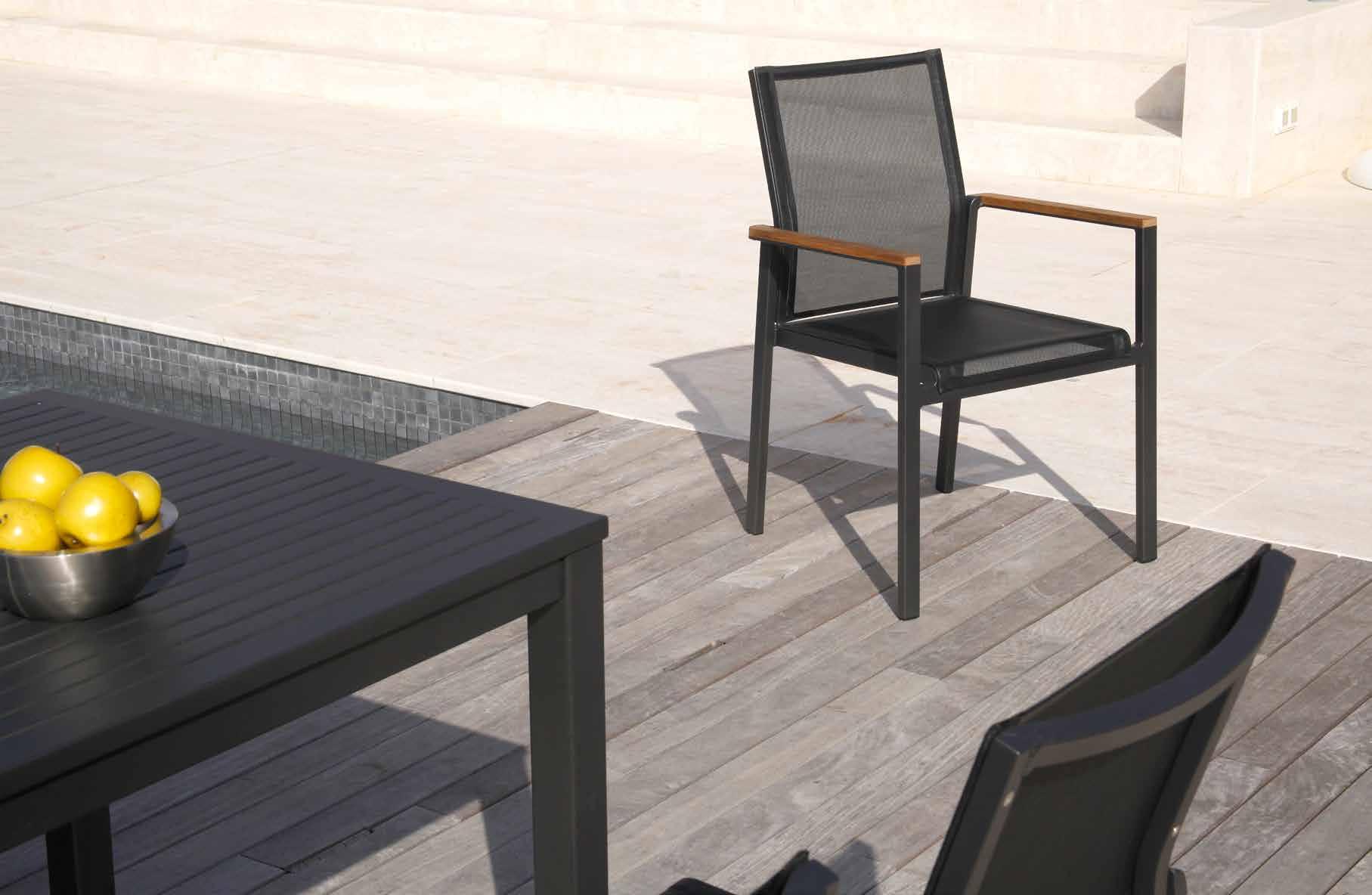 Für maximalen Sitzkomfort sorgen Equinox Armlehnstühle mit Gestellen aus hochwertigen und rostfreiem 316er-Edelstahl , Sitz- und Rückenlehnen aus Textilene®-Bespannung in Charcoal und Armlehnen in der Farbe Graphit.