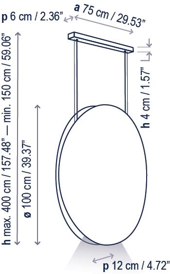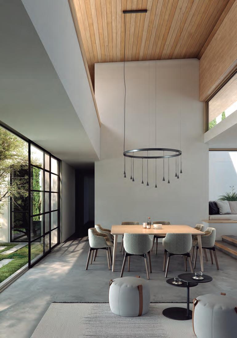 The Roda Collection is characterized by its large, cylindrical, ring-shaped shade. Its inner contour is surrounded by an aluminum ring housing a continuous circle of LEDs, emitting a uniform, filtered light. The warmth of the ribbon is highlighted by the dark ring outlining the perimeter, making these fixtures particularly cozy and lightweight, because despite their large volume, they seem weightless.