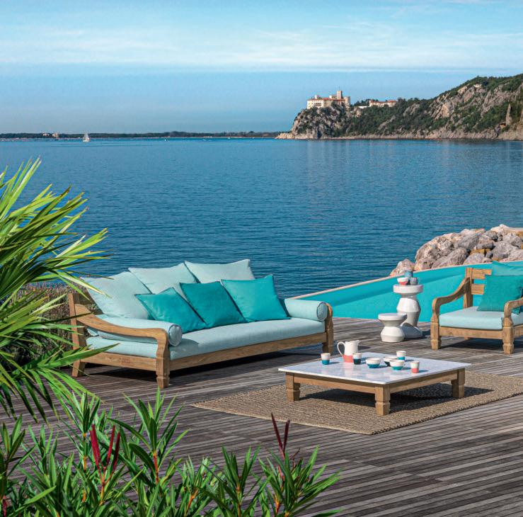 Iroko wood is a particularly hard species from the forests of tropical Africa. Being a resinous wood, it is naturally protected against water and moisture. It features impressive mechanical qualities, such as resistance to bending. The Accardi Jacquard fabric is a high technical content fabric crafted by skilled textile artisans. With a polyester soul and a PVC covering, it is waterproof, resistant to UV rays, durable, lightweight and easy to clean. It is also anti-algae, anti-bacterial, anti-mould and non-toxic breathable.