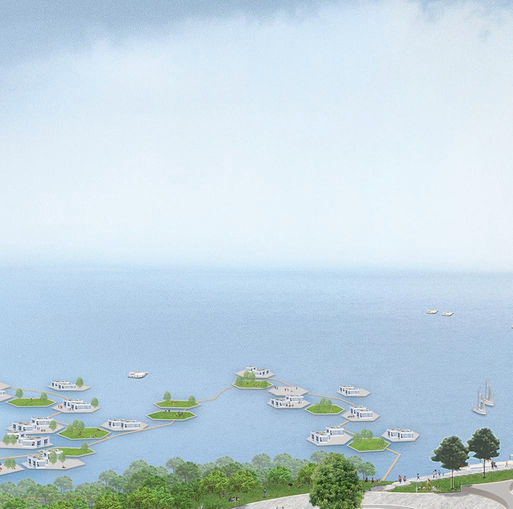 The coastal defense strategy utilizes a sea wall built using hollow caisson sections. The space within these hollow sections is used as circulation and service corridors. The surface/ top part of the caisson is staggered to house planting/ growth medium that can support various types of vegetation - especially mangroves. This stepped section together with the mangroves thus provides an ideal naturalized-cum-engineered buffer against varying sea levels as shown here. NaturalizedEdges Floating structures in the sea Activity mobility corridors and trams Parks and Green Corridors/ connectors Mangrovesalongthe sea-facingedge