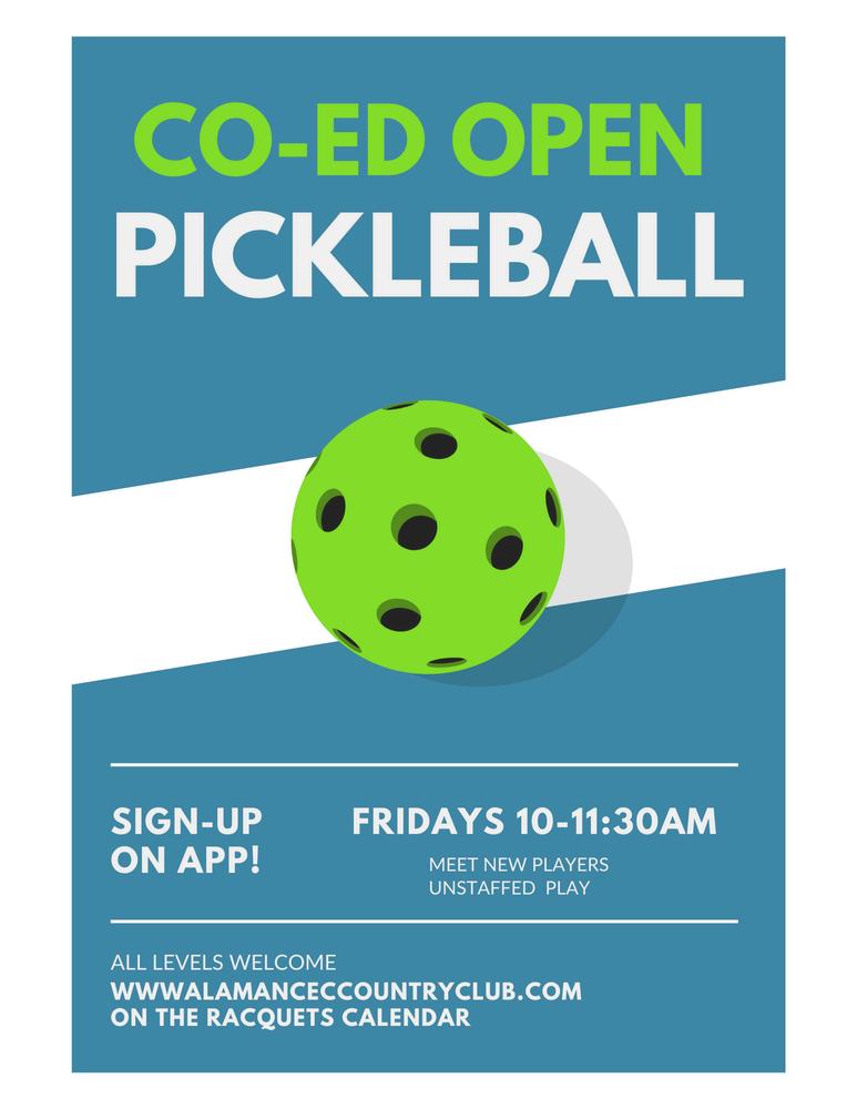 6:30p - 8:30p: Men’s Night 10:00a - 11:30a: Co-Ed Open Pickleball